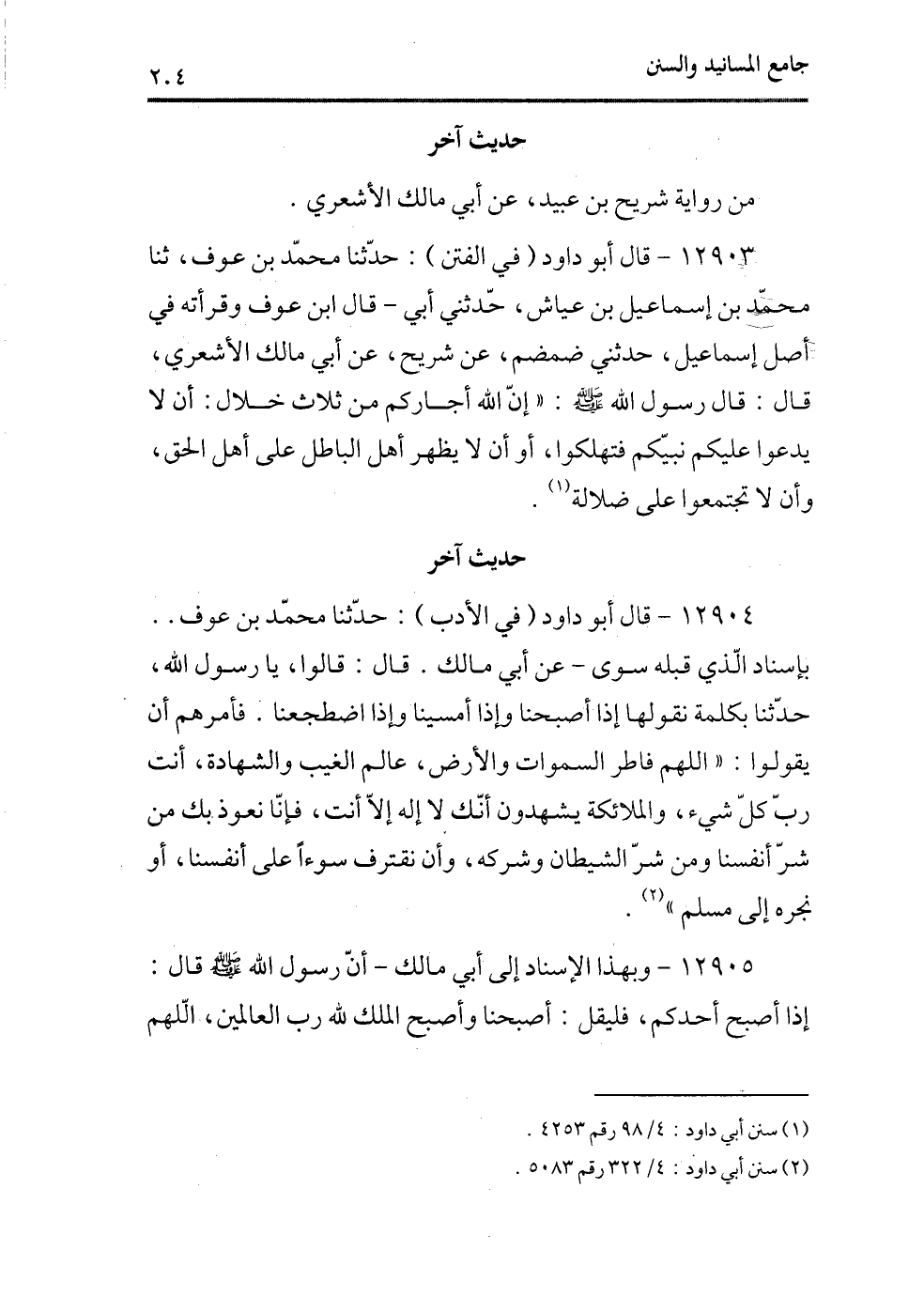 12903 - قال أبو داود (في الفتن) : حدثنا محمد بن عوف، ثنا محمد بن إسماعيل بن عياش، حدثني أبي - قال ابن عوف وقرأته في أصل إسماعيل، حدثني ضمضم، عن شريح، عن أبي مالك الأشعري، قال: قال رسول الله - صلى الله عليه وسلم -: ((إن الله أجاركم من ثلاث خلال: أن لايدعوا عليكم نبيكم فتهلكوا، أو أن لايظهر أهل الباطل على أهل الحق، وأن لاتجتمعوا على ضلالة (¬1) .