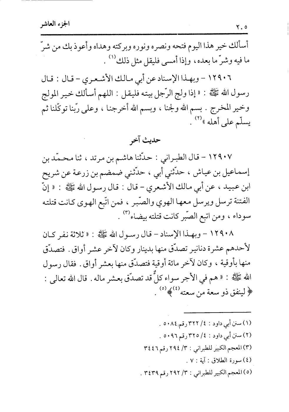 12906 - وبهذا الإسناد عن أبي مالك الأشعري - قال: قال رسول الله - صلى الله عليه وسلم -: ((إذا ولج الرجل بيته فليقل: اللهم أسألك خير المولج وخير المخرج. بسم الله ولجنا، وبسم الله أخرجنا، وعلى ربنا توكلنا ثم يسلم على أهله)) (¬1) .