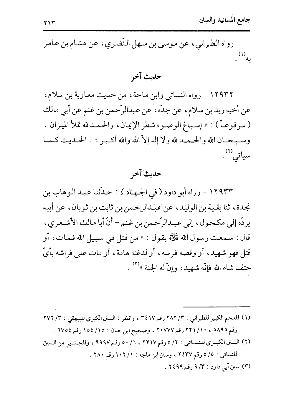 12932 - رواه النسائي وابن ماجة، من حديث معاوية بن سلام، عن أخيه زيد ابن سلام، عن جده، عن عبد الرحمن بن غنم عن أبي مالك (مرفوعاً) : ((إسباغ الوضوء شطر الإيمان، والحمد لله تملأ الميزان، وسبحان الله والحمد لله ولاإله إلاالله والله أكبر)) . الحديث كما سيأتي (¬1) .