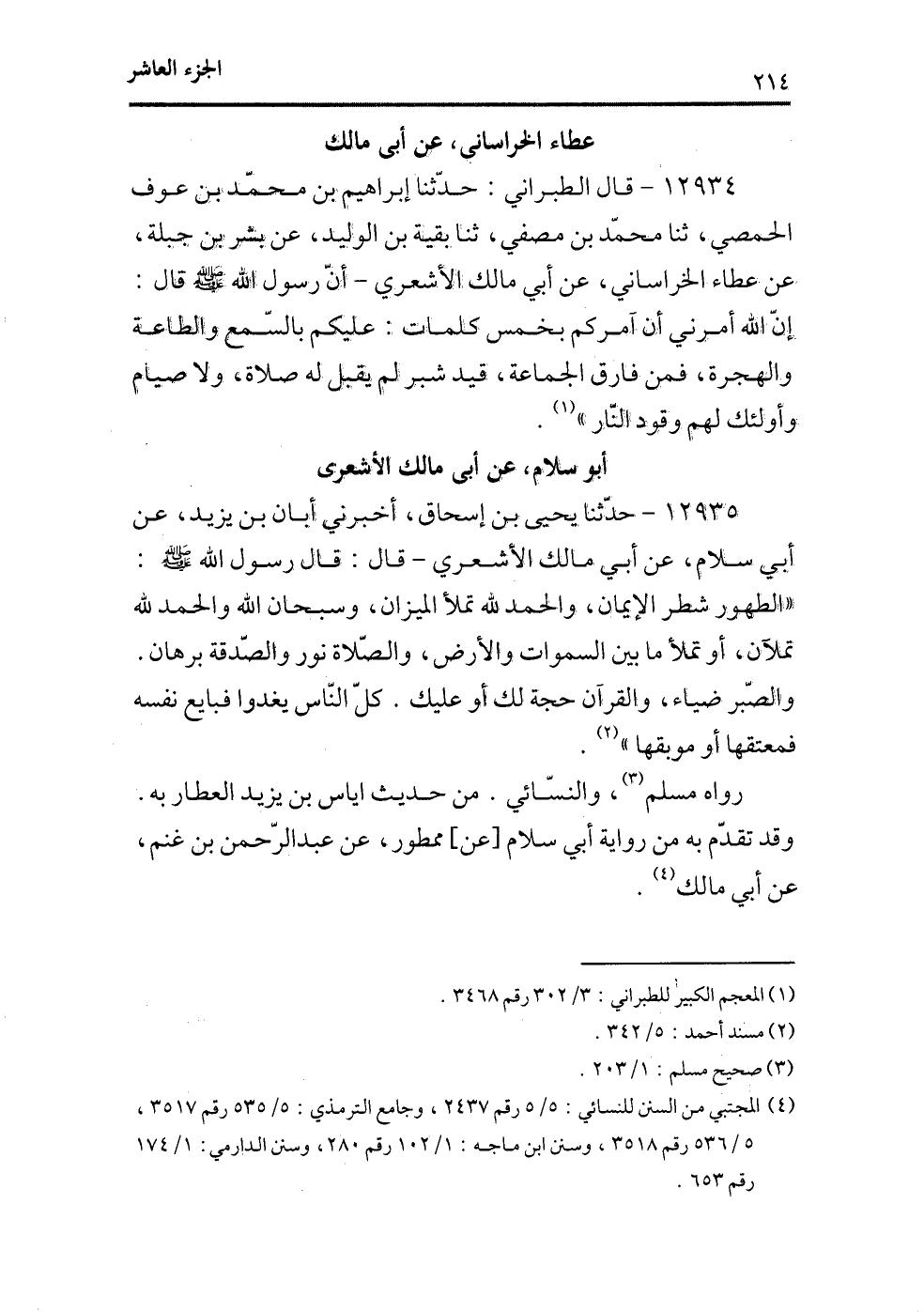 12935 - حدثنا يحيى بن إسحاق، أخبرني أبان بن يزيد، عن أبي سلام، عن أبي مالك الأشعري - قال: قال رسول الله - صلى الله عليه وسلم -: ((الطهور شطر الإيمان، والحمد لله تملأ الميزان، وسبحان الله والحمد لله تملآن، أو تملأ مابين السموات والأرض، والصلاة نور والصدقة برهان، والصبر ضياء، والقرآن حجة لك أو عليك. كل الناس يغدوا فبايع نفسه فمعتقها أو موبقها)) (¬2) .