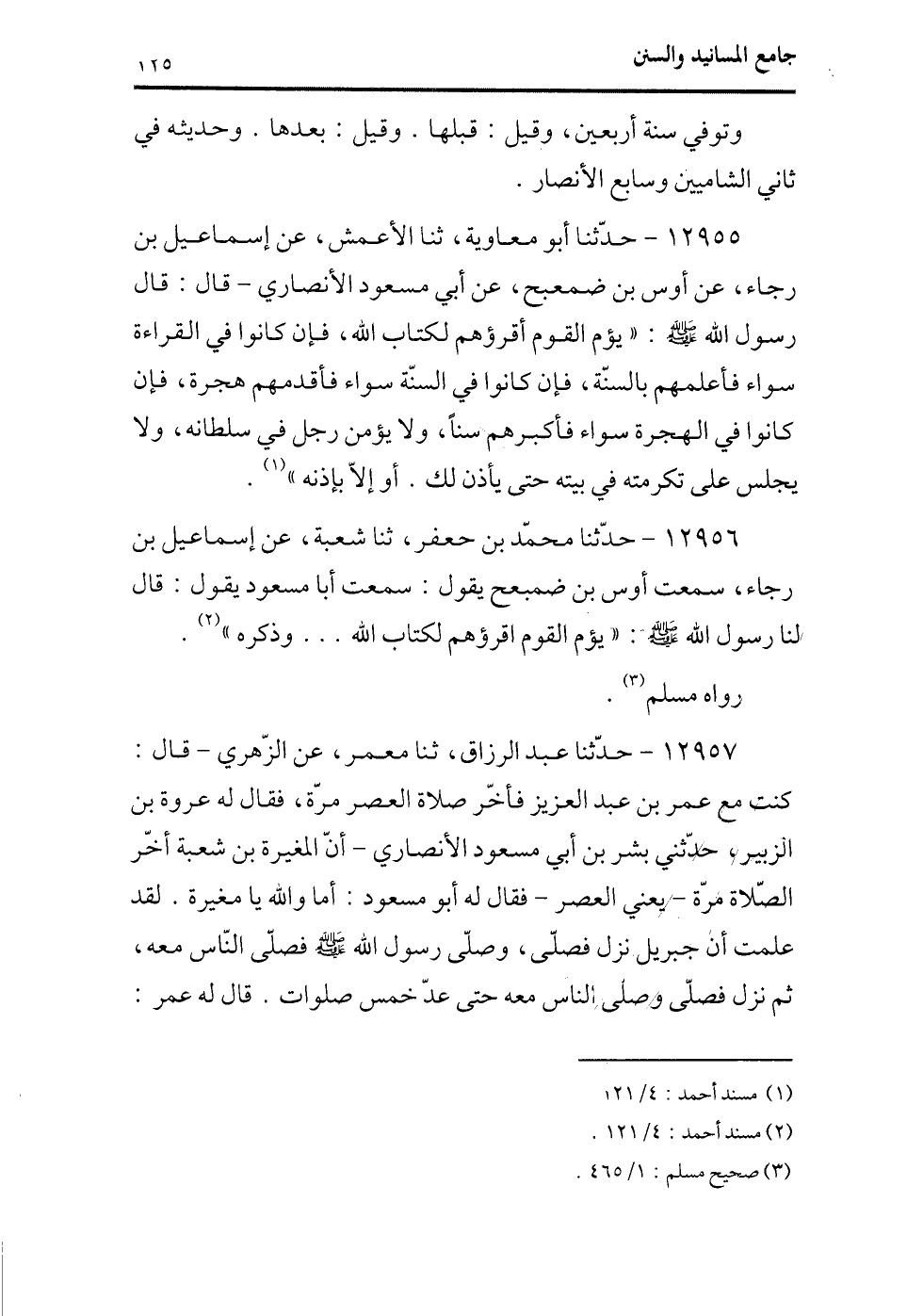 12956 - حدثنا محمد بن جعفر، ثنا شعبة، عن إسماعيل بن رجاء، سمعت أوس بن ضمبعج يقول: سمعت أبا مسعود يقول: قال لنا رسول الله - صلى الله عليه وسلم -: ((يؤم القوم أقرؤهم لكتاب الله ... وذكره)) (¬2) .