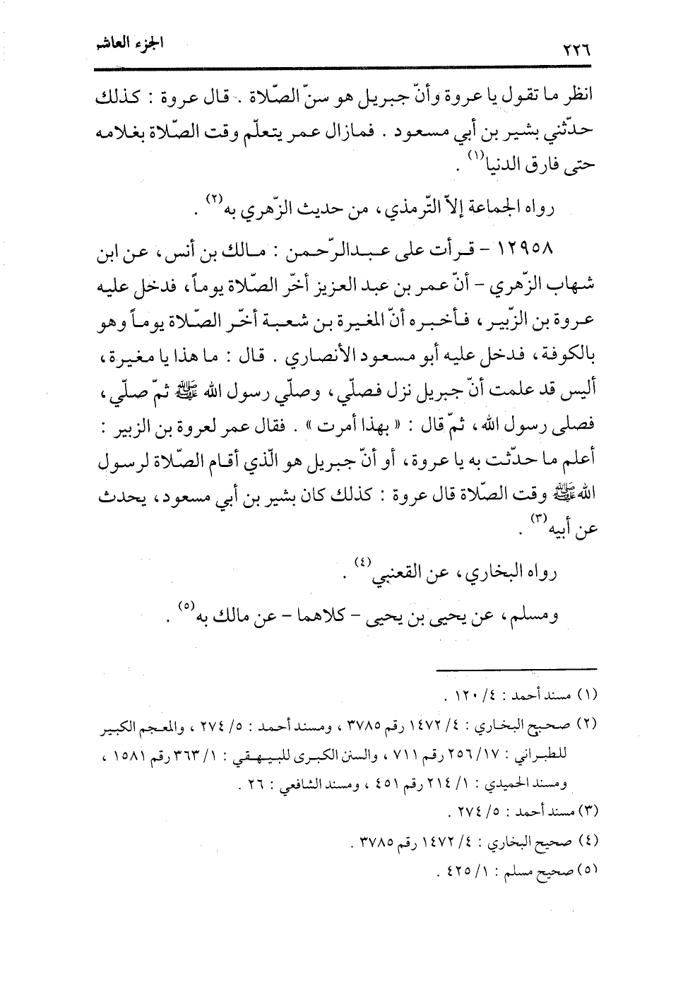 12958 - قرأت على عبد الرحمن: مالك بن أنس، عن ابن شهاب الزهري -أن عمر بن عبد العزيز أخر الصلاة يوماً، فدخل عليه عمر بن الزبير، فأخبره أن المغيرة بن شعبة أخر الصلاة يوماً وهو بالكوفة، فدخل عليه أبو مسعود الأنصاري. قال: ماهذه يامغيرة، أليس قد علمت أن جبريل نزل فصلى، وصلى رسول الله - صلى الله عليه وسلم - ثم صلى، فصلى رسول الله، ثم قال: ((بهذا أمرت)) . فقال عمر لعروة بن الزبير: أعلم ماحدثت به ياعروة، أو أن جبريل هو الذي أقام الصلاة لرسول الله - صلى الله عليه وسلم - وقت الصلاة قال عروة: كذلك كان بشير بن أبي مسعود، يحدث عن أبيه (¬1) .