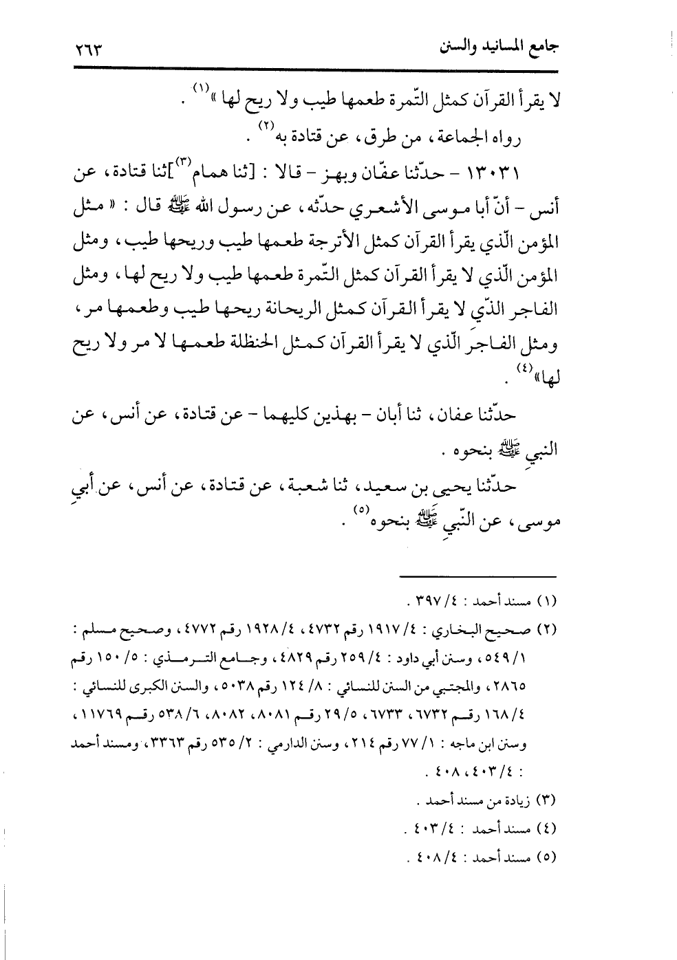 13031 - حدثنا عفان وبهز - قالا: [ثنا همام] (¬1) ثنا قتادة، عن أنس - أن أبا موسى الأشعري حدثه، عن رسول الله - صلى الله عليه وسلم - قال: ((مثل المؤمن الذي يقرأ القرآن كمثل الأترجة طعمها طيب وريحها طيب، ومثل المؤمن الذي لايقرأ القرآن كمثل التمرة طعمها طيب ولاريح لها، ومثل الفاجر الذي يقرأ القرآن كمثل الريحانة ريحها طيب وطعمها مر، ومثل الفاجر الذي لايقرأ القرآن كمثل الحنظلة طعمها مر ولاريح لها)) (¬2) .