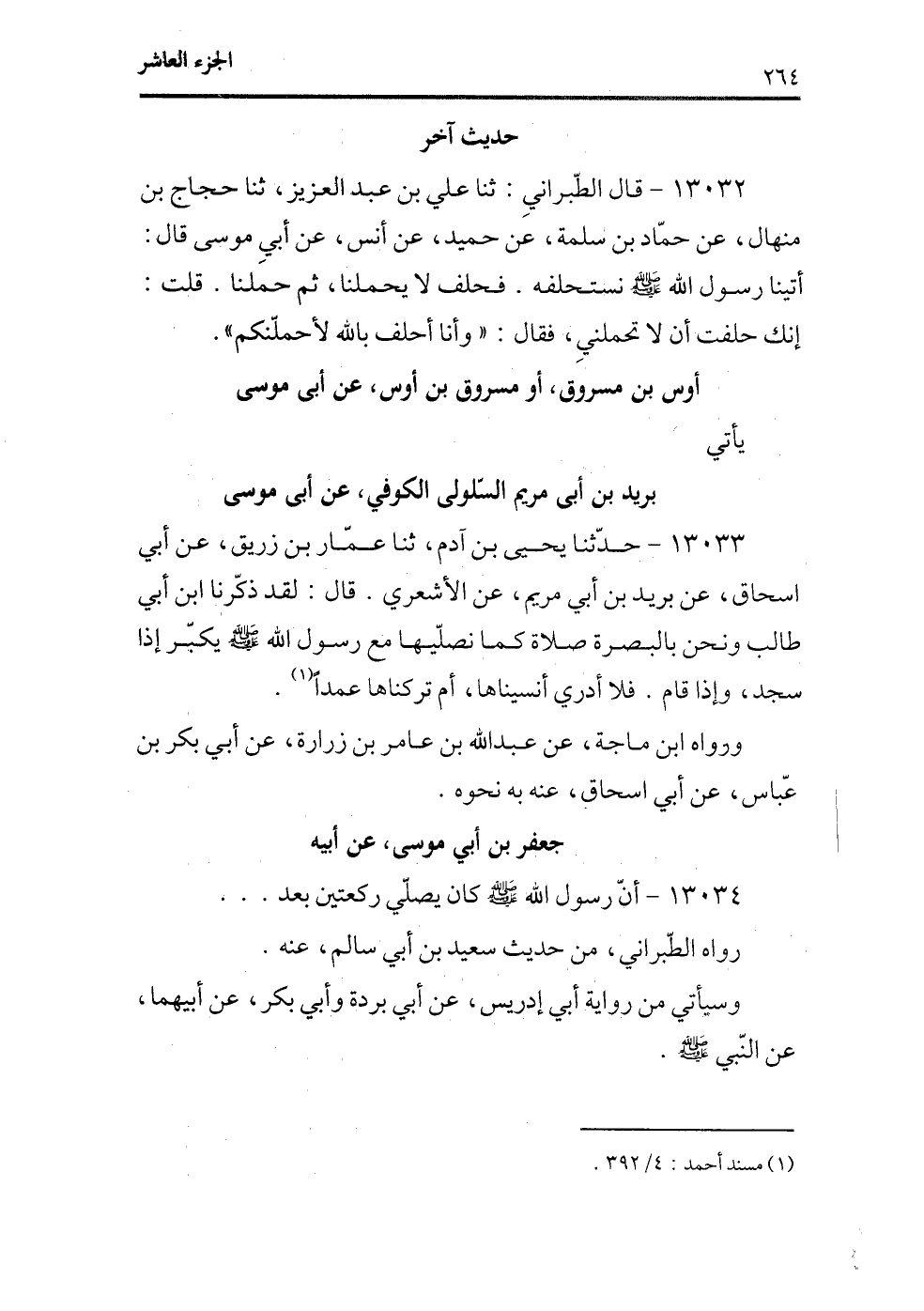 13032 - قال الطبراني: ثنا علي بن عبد العزيز، ثنا حجاج بن منهال، عن حماد بن سلمة، عن حميد، عن أنس، عن أبي موسى قال: أتينا رسول الله - صلى الله عليه وسلم - نستحلفه. فحلف لايحملنا، ثم حملنا، قلت: إنك حلفت أن لا تحملني، فقال: ((وأنا أحلف بالله لأحملنكم)) .