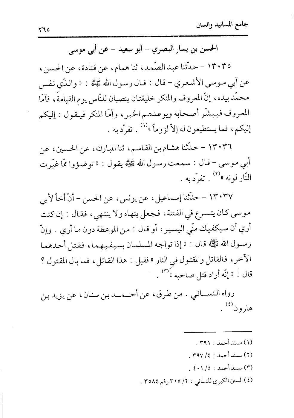 13036 - حدثنا هشام بن القاسم، ثنا المبارك، عن الحسين، عن أبي موسى -قال: سمعت رسول الله - صلى الله عليه وسلم - يقول: ((توضؤوا مما غيرت النار لونه)) (¬2) . تفرد به.