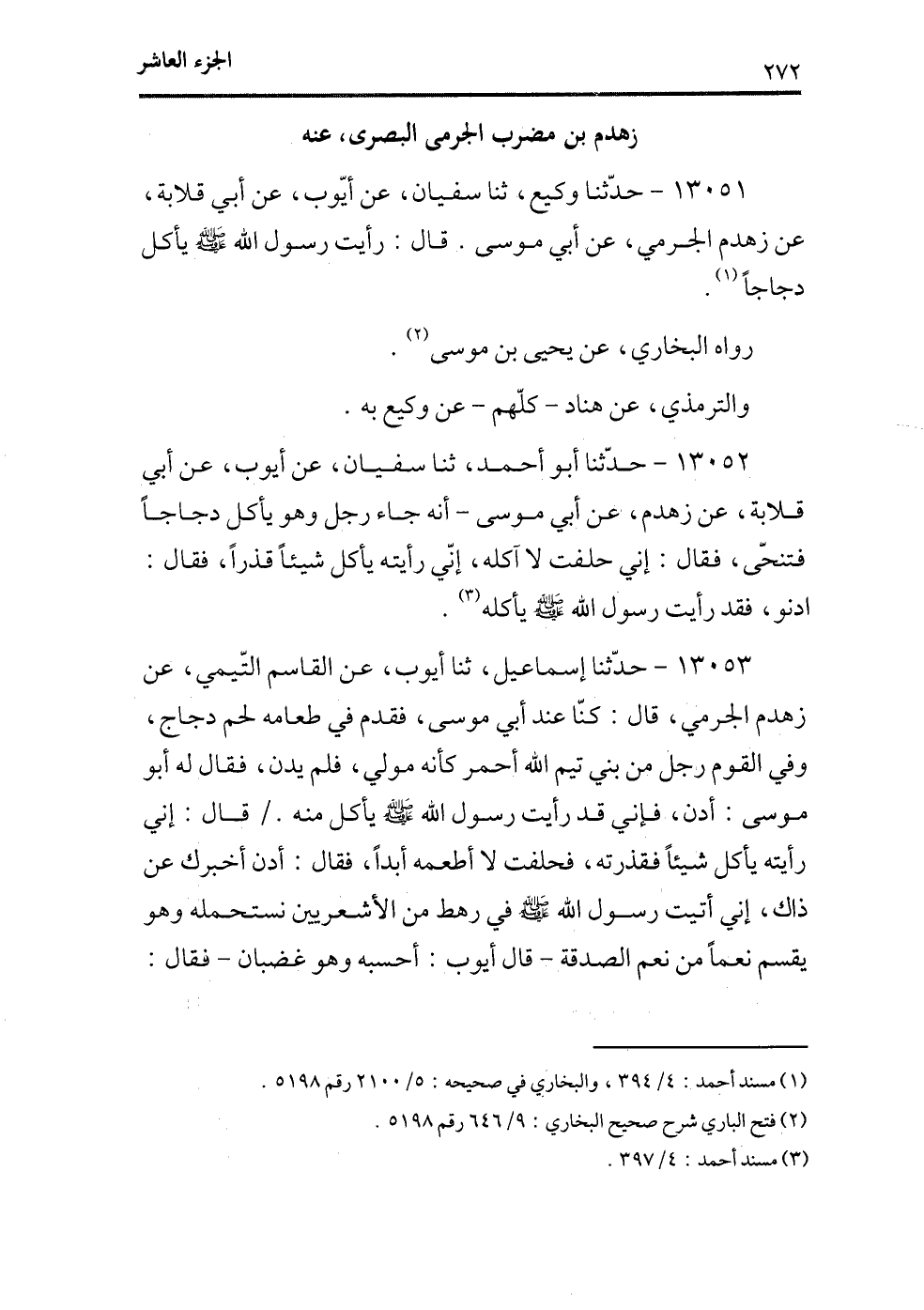 13051 - حدثنا وكيع، ثنا سفيان، عن أيوب، عن أبي قلابة، عن زهدم الجرمي، عن أبي موسى. قال: رأيت رسول الله - صلى الله عليه وسلم - يأكل دجاجاً (¬1) .