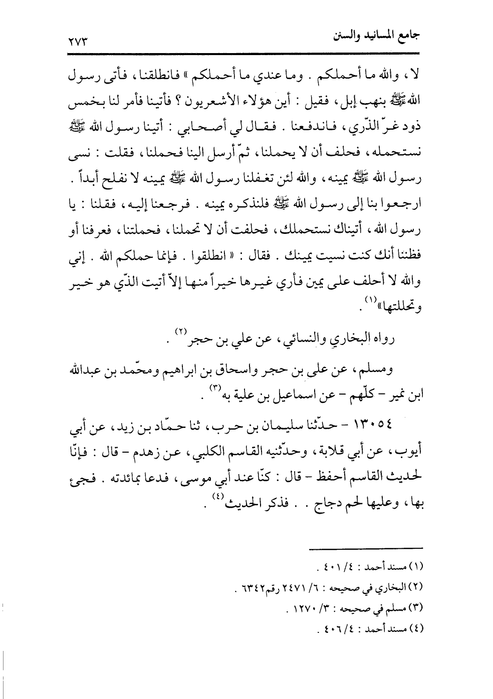13054 - حدثنا سليمان بن حرب، ثنا حماد بن زيد، عن أبي أيوب، عن أبي قلابة، وحدثنيه القاسم الكلبي، عن زهدم -قال: فإنا لحديث القاسم أحفظ- قال: كنا عند أبي موسى، فدعا بمائدته. فجيء بها، وعليها لحم دجاج..فذكر الحديث (¬1) .