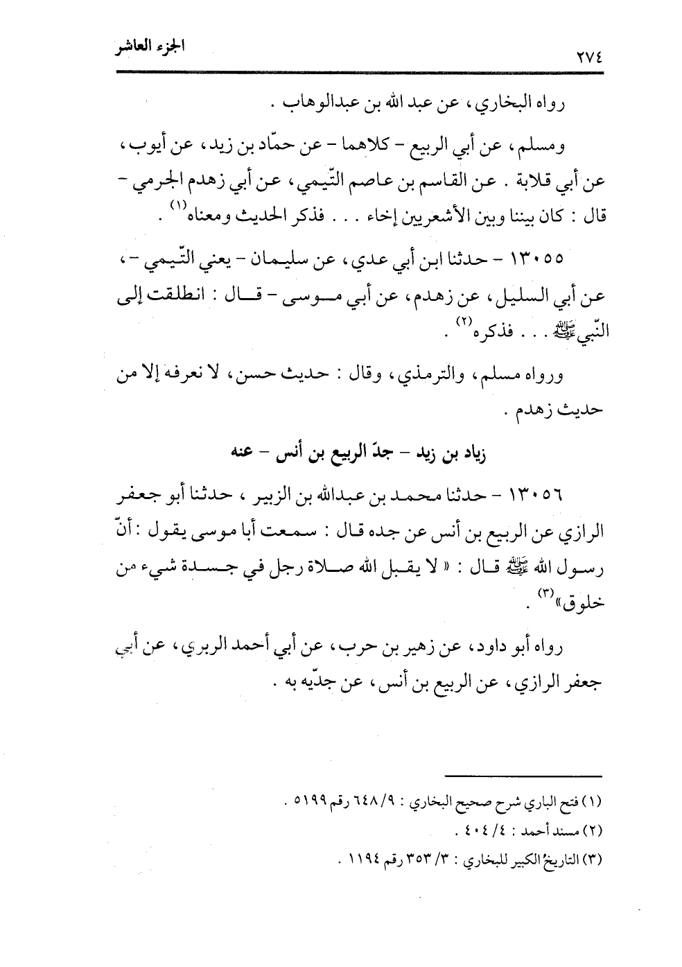 13056 - حدثنا محمد بن عبد الله بن الزبير، حدثنا أبو جعفر الرازي عن الربيع بن أنس عن جده قال: سمعت أبا موسى يقول: أن رسول الله - صلى الله عليه وسلم - قال: ((لايقبل الله صلاة رجل في جسده شيء من خلوق)) (¬2) .
