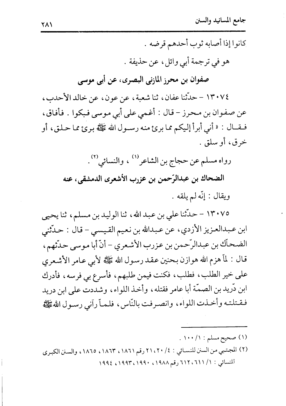 13075 - حدثنا علي بن عبد الله، ثنا الوليد بن مسلم، ثنا يحيى بن عبد العزيز الأزدي، عن عبد الله بن نعيم القيسي - قال: حدثني الضحاك بن عبد الرحمن بن عزرب الأشعري - أن أبا موسى حدثهم، قال: لما هزم الله هوازن بحنين عقد رسول الله - صلى الله عليه وسلم - لأبي عامر الأشعري على خير الطلب، فطلب، فكنت فيمن طلبهم، فأسرع بي فرسه، فأدرك ابن دريد بن الصمة أبا عامر فقتله، وأخذ اللواء، وشددت على ابن دريد فقتلته وأخذت اللواء، وانصرفت بالناس، فلما رآني رسول الله - صلى الله عليه وسلم -