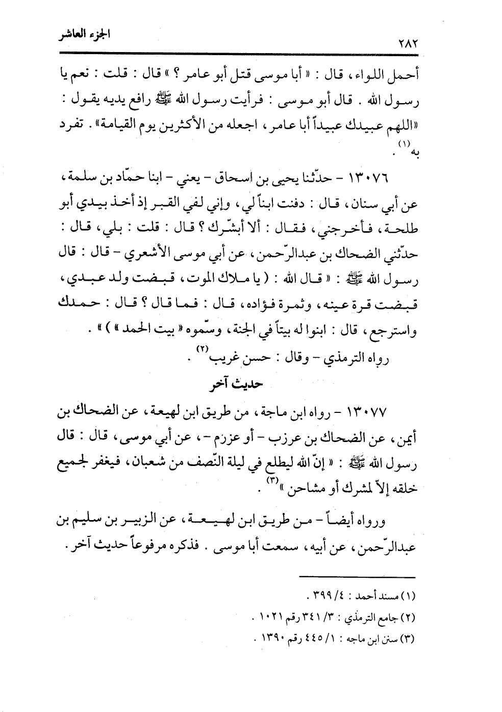 13076 - حدثنا يحيى بن إسحاق -يعني- ابنا حماد بن سلمة، عن أبي سنان، قال: دفنت ابناً لي، وإني لفي القبر إذ أخذ بيدي أبو طلحة، فأخرجني، فقال: ألا أبشرك؟ قال: قلت: بلى، قال: حدثني الضحاك بن عبد الرحمن، عن أبي موسى الأشعري -قال: قال رسول الله - صلى الله عليه وسلم -: ((قال الله:) ياملاك الموت، قبضت ولد عبدي، قبضت قرة عينه، وثمرة فؤاده، قال: فما قال؟ قال: حمدك واسترجع، قال: ابنو له بيتاً في الجنة، وسموه () بيت الحمد)) )) .