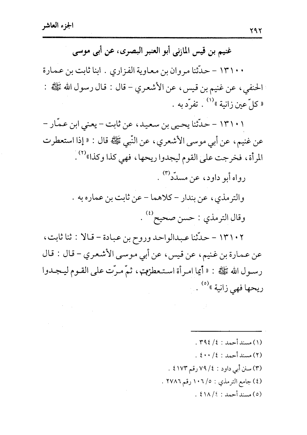 13102 - حدثنا عبد الواحد وروح بن عبادة -قالا: ثنا ثابت، عن عمارة بن غنيم، عن قيس، عن أبي موسى الأشعري- قال: قال رسول الله - صلى الله عليه وسلم -: ((أيما إمرأة استعطرت، ثم مرت على القوم ليجدوا ريحها فهي زانية)) (¬5) .