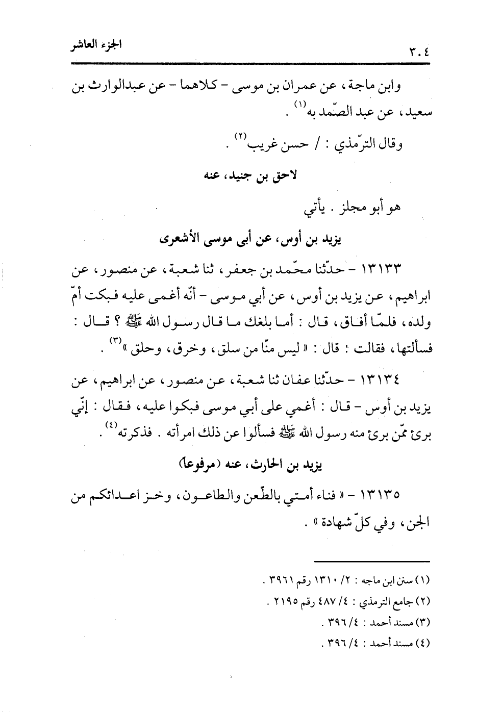 13134 - حدثنا عفان ثنا شعبة، عن منصور، عن إبراهيم، عن يزيد بن أوس -قال: أغمي على أبي موسى فبكوا عليه، فقال: إني برئ ممن برأ منه رسول الله - صلى الله عليه وسلم - فسألوه عن ذلك إمرأته. فذكرته (¬2) .