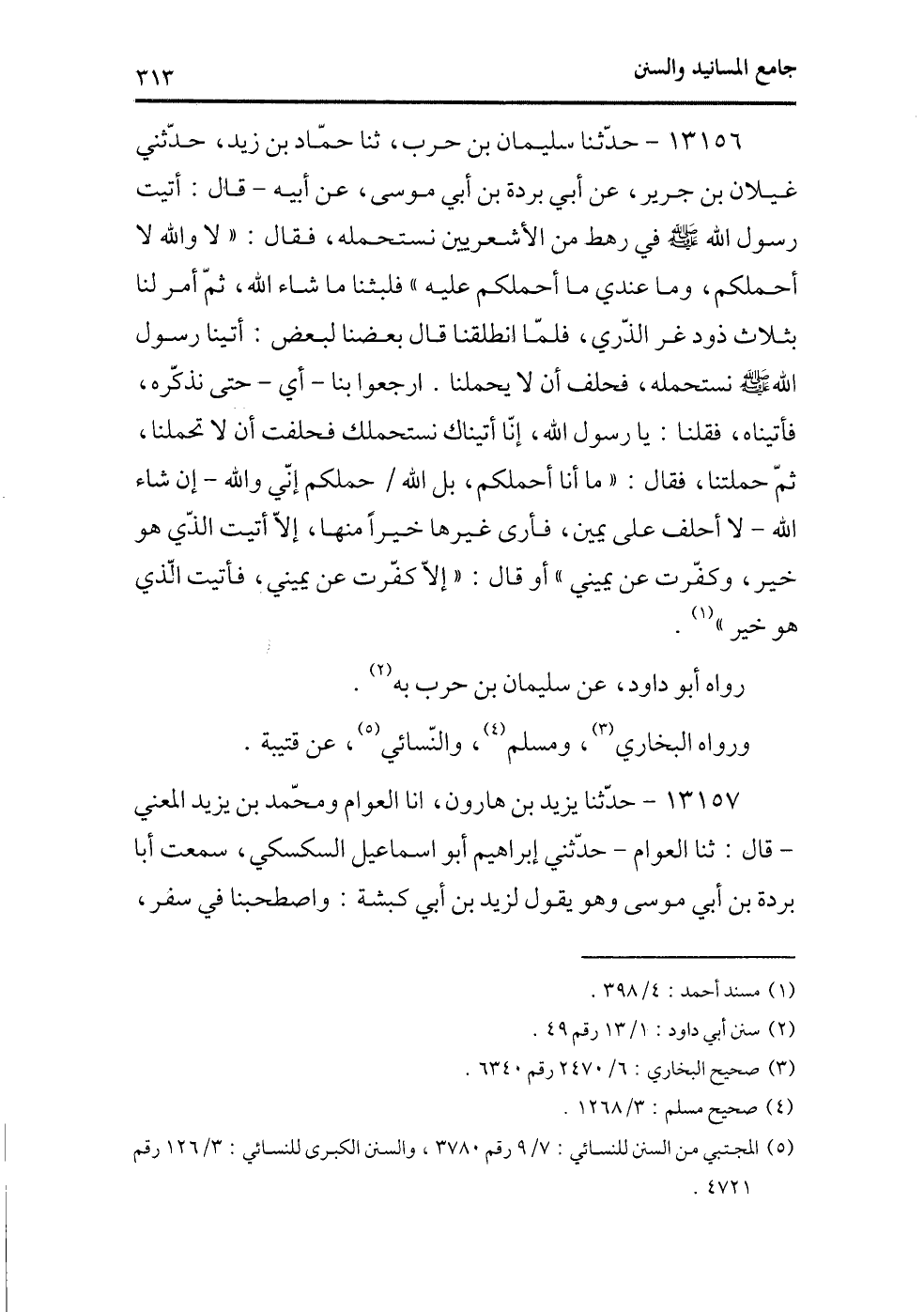 13156 - حدثنا سليمان بن حرب، ثنا حماد بن زيد، حدثني غيلان بن جرير، عن أبي بردة بن أبي موسى، عن أبيه -قال: أتيت رسول الله - صلى الله عليه وسلم - في رهط من الأشعريين نستحمله، فقال: ((لا والله لاأحملكم، وماعندي ماأحملكم عليه)) فلبثنا ماشاء الله، ثم أمر لنا بثلاث ذود غر الذري، فلما انطلقنا قال بعضنا لبعض: أتينا رسول الله - صلى الله عليه وسلم - نستحمله، فحلف أن لايحملنا. ارجعوا بنا - أي - حتى نذكره، فأتيناه، فقلنا: يارسول الله، إنا أتيناك نستحملك فحلفت أن لاتحملنا، ثم حملتنا، فقال: ((ماأنا أحملكم، بل الله/ حملكم إني والله - إن شاء الله - لا أحلف على يمين، فأرى غيرها خيراً منها، إلا أتيت الذي هو خير، وكفرت عن يميني)) أو قال: ((إلا كفرت عن يميني، فأتيت الذي هو خير)) (¬1) .