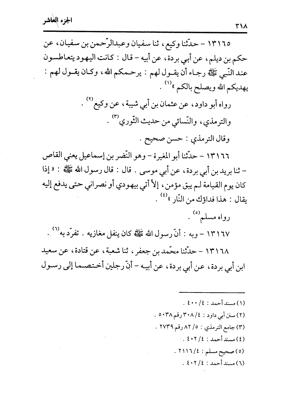 13166 - حدثنا أبو المغيرة - وهو النضر بن إسماعيل يعني القاص - ثنا بريد ابن أبي بردة، عن أبي موسى. قال: قال رسول الله - صلى الله عليه وسلم -: ((إذا كان يوم القيامة لم يبق مؤمن، إلا أتى بيهودي أو نصراني حتى يدفع إليه يقال: هذا فداؤك من النار)) (¬4) .