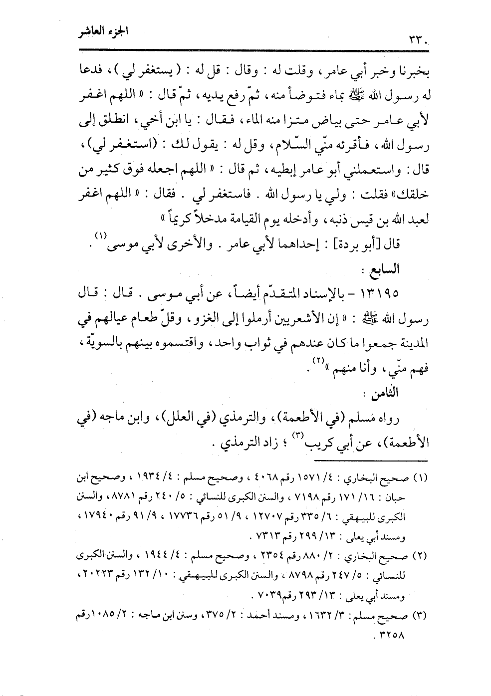 بخبرنا وخبر أبي عامر، وقلت له: وقال: قل له: (يستغفر لي) ، فدعا له رسول الله - صلى الله عليه وسلم - بماء فتوضأ منه، ثم رفع يديه، ثم قال: ((اللهم اغفر لأبي عامر حتى بياض متزا منه الماء، فقال: ياابن أخي، انطلق إلى رسول الله، فأقرئه مني السلام، وقل له: يقول لك: (استغفر لي) ، قال: واستعملني أبو عامر إبطيه، ثم قال: ((اللهم اجعله فوق كثير من خلقك)) فقلت: ولي يارسول الله. فاستغفر لي. فقال: () اللهم اغفر لعبد الله بن قيس ذنبه، وأدخله يوم القيامة مدخلاً كريماً)) .