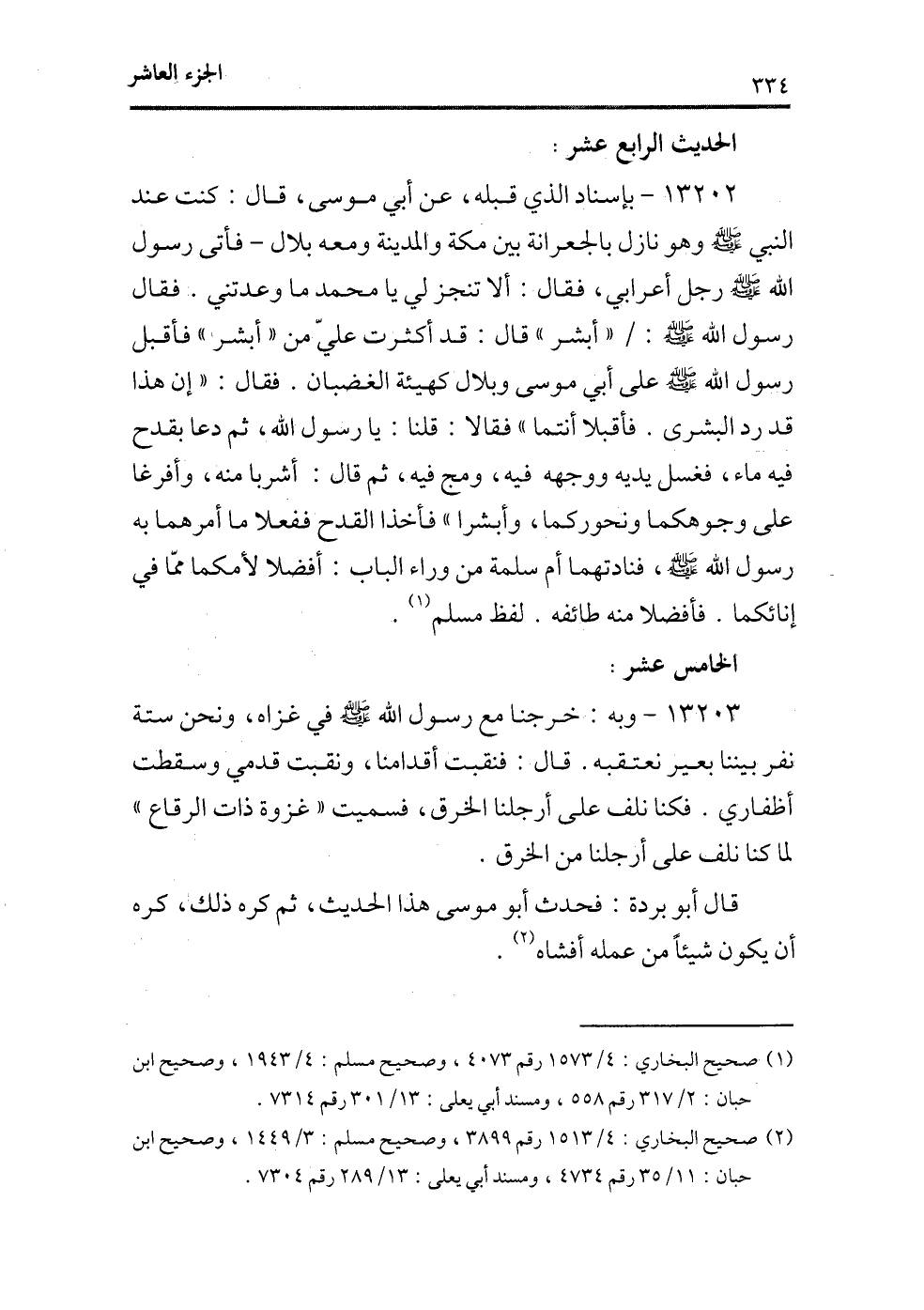 13202 - بإسناد الذي قبله، عن أبي موسى، قال: كنت عند النبي - صلى الله عليه وسلم - وهو نازل بالجعرانة بين مكة والمدينة ومعه بلال - فأتى رسول الله - صلى الله عليه وسلم - رجل أعرابي، فقال: ألا تنجز لي يامحمد ماوعدتني. فقال رسول الله - صلى الله عليه وسلم -: / ((أبشر)) قال: قد أكثرت علي من ((أبشر)) فأقبل رسول الله - صلى الله عليه وسلم - على أبي موسى وبلال كهيئة الغضبان. فقال: ((إن هذا قد رد البشرى. فأقبلا أنتما)) فقالا: قلنا: يارسول الله، ثم دعا بقدح فيه ماء، فغسل يديه ووجهه فيه، ومج فيه، ثم قال: أشربا منه، وأفرغا على وجوهكما ونحوركما، وأبشرا)) فأخذ القدح ففعلا ما أمرهما به رسول الله - صلى الله عليه وسلم -، فنادتهما أم سلمة من وراء الباب: أفضلا لأمكما مما في إنائكما. فأفضلا منه طائفة. لفظ مسلم (¬1) .