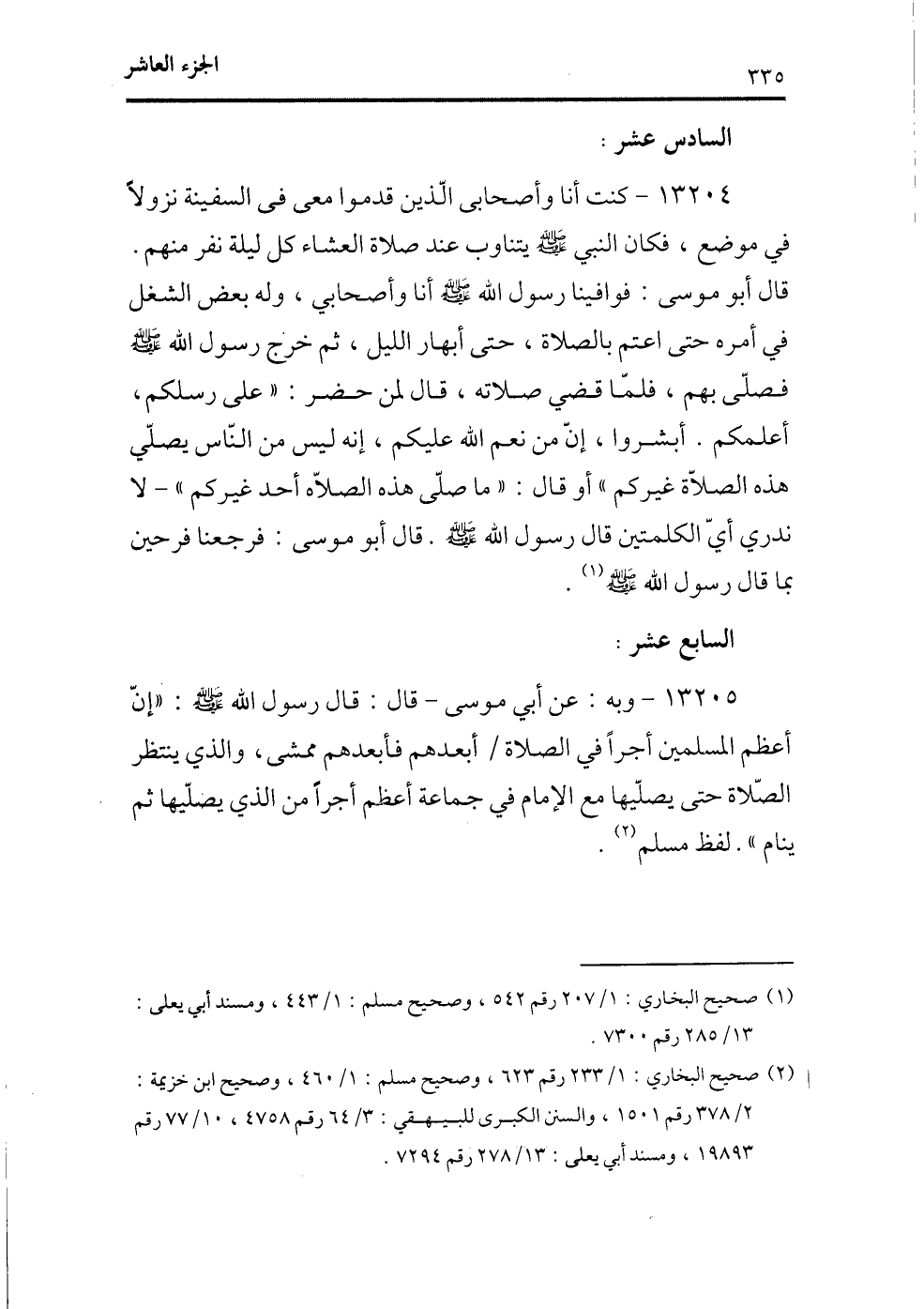 13204 - كنت أنا وأصحابي الذين قدموا معي في السفينة نزولاً في موضع، فكان النبي - صلى الله عليه وسلم - يتناوب عن صلاة العشاء كل ليلة نفر منهم. قال أبو موسى: فوافينا رسول الله - صلى الله عليه وسلم - أنا وأصحابي، وله بعض الشغل في أمره حتى اعتم بالصلاة، حتى أبهار الليل، ثم خرج رسول الله - صلى الله عليه وسلم - فصلى بهم، فلما قضي صلاته، قال لمن حضر: ((على رسلكم، أعلمكم، أبشروا، إن من نعم الله عليكم، إنه ليس من الناس يصلي هذه الصلاة غيركم)) أو قال: ((ماصلى هذه الصلاة أحد غيركم)) - لاندري أي الكلمتين قال رسول الله - صلى الله عليه وسلم -. قال أبو موسى: فرجعنا فرحين بما قال رسول الله - صلى الله عليه وسلم - (¬1) .