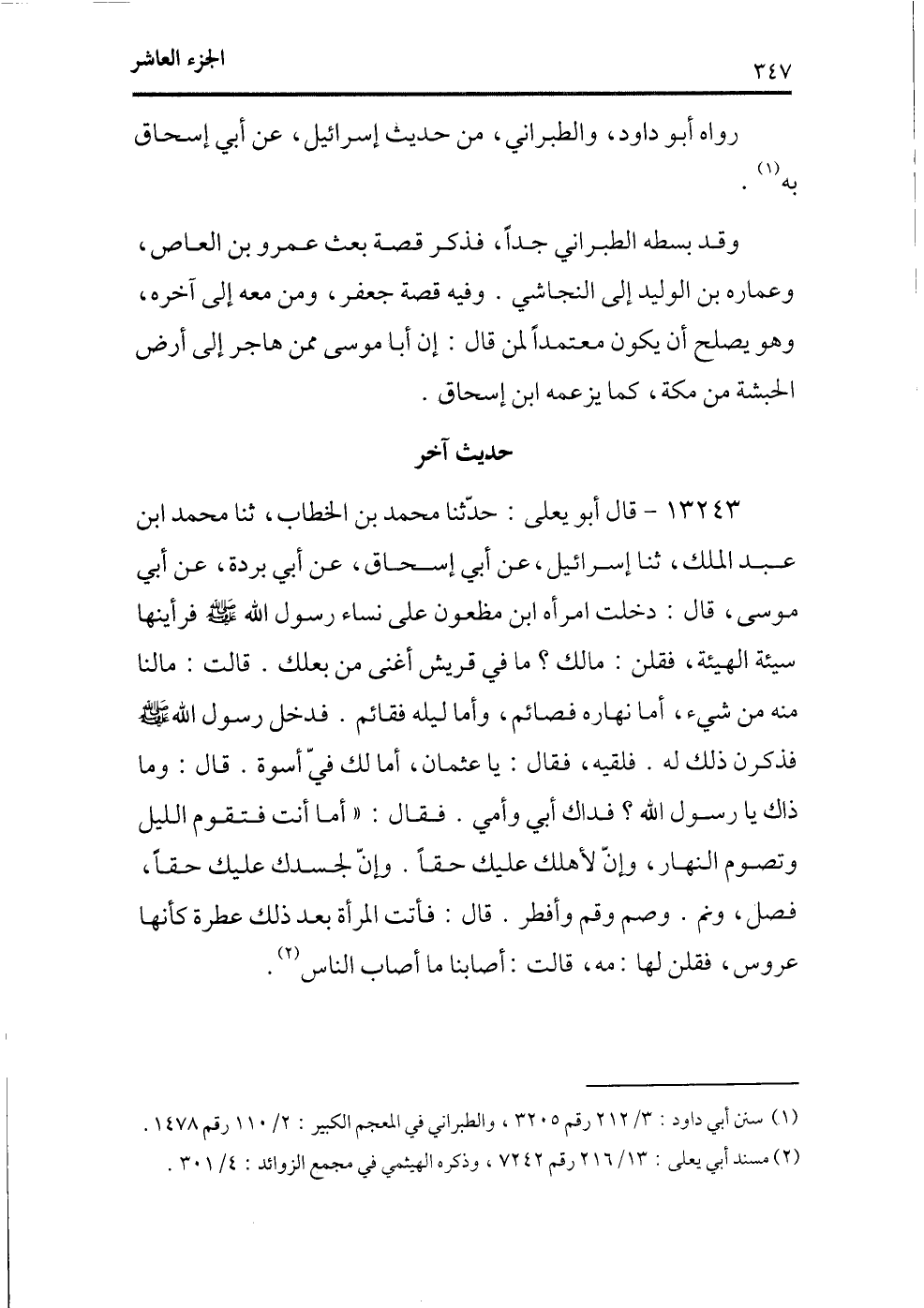13243 - قال أبو يعلى: حدثنا محمد بن الخطاب، ثنا محمد بن عبد الملك، ثنا إسرائيل، عن أبي إسحاق، عن أبي بردة، عن أبي موسى، قال: دخلت إمرأة ابن مظعون على نساء رسول الله - صلى الله عليه وسلم - فرأينها سيئة الهيئة، فقلن: مالك؟ مافي قريش أغنى من بعلك. قالت: مالنا منه من شيء، أما نهاره فصائم، وأما ليله فقائم. فدخل رسول الله - صلى الله عليه وسلم - فذكرن ذلك له. فلقيه، فقال: ياعثمان، أما لك في أسوة. قال: وماذاك يارسول الله؟ فداك أبي وأمي. فقال: ((أما أنت فتقوم الليل وتصوم النهار، وإن لأهلك عليك حقاً. وإن لجسدك عليك حقاً، فصل، ونم. وصم وقم وأفطر. قال: فأتت المرأة بعد ذلك عطرة كأنها عروس، فقلن لها: مه، قالت: أصابنا ماأصاب الناس (¬1) .