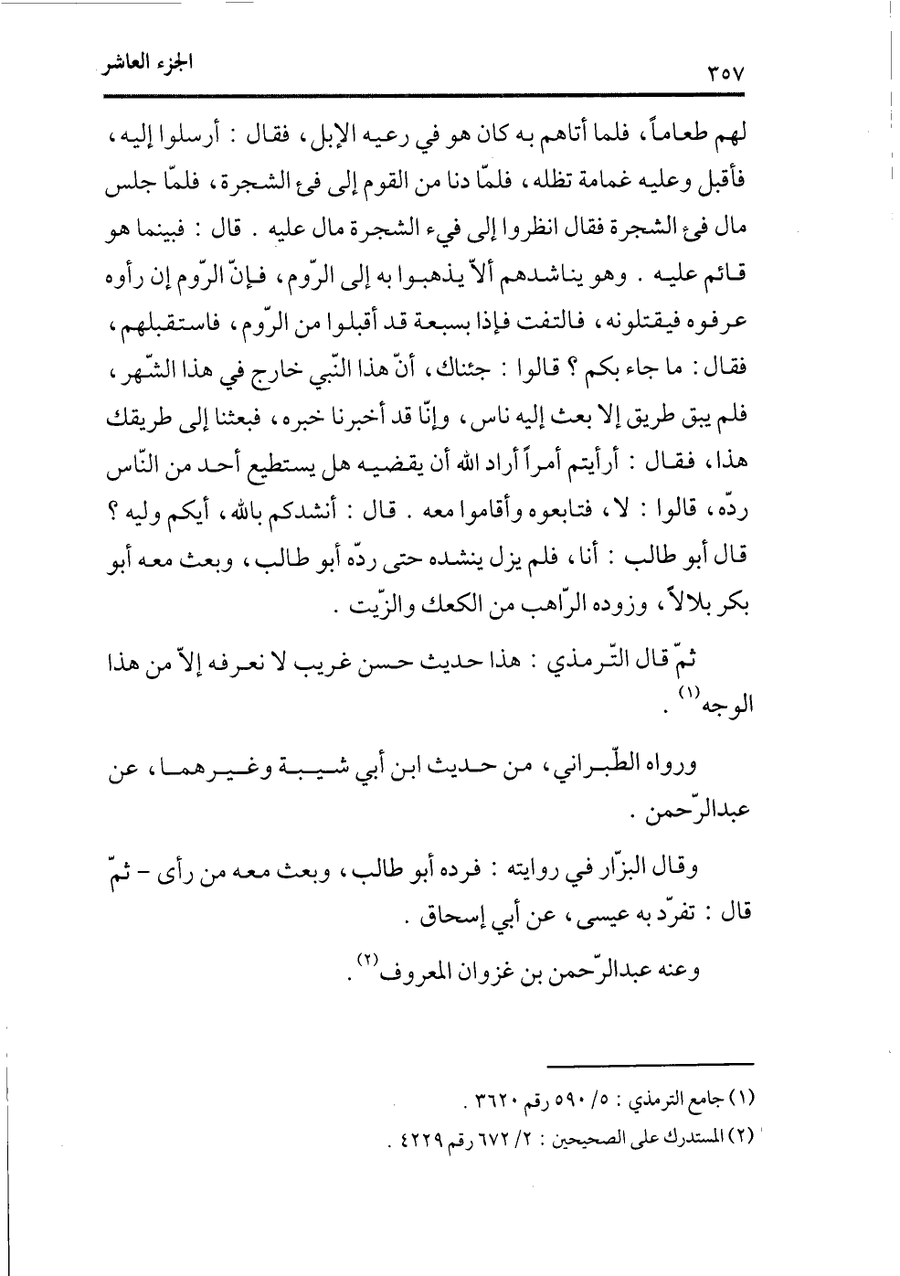 لهم طعاماً، فلما أتاهم به كان هو في رعيه الإبل، فقال: أرسلوا إليه، فأقبل وعليه غمامة تظله، فلما دنا من القوم إلى فيء الشجرة، فلما جلس مال فيء الشجرة فقال انظروا إلى فيء الشجرة مال عليه. قال: فبينما هو قائم عليه. وهو يناشدهم ألا يذهبوا به إلى الروم، فإن الروم إن رأوه عرفوه فيقتلونه، فالتفت فإذا بسبعة قد أقبلوا من الروم، فاستقبلهم، فقال: ماجاء بكم؟ قالوا: جئناك، أن هذا النبي خارج في هذا الشهر، فلم يبق طريق إلا بعث إليه ناس، وإنا قد أخبرناه خبره، فبعثنا إلى طريقك هذا، فقال: أرأيتم أمراً أراد الله أن يقضيه هل يستطيع أحد من الناس رده، قالوا: لا، فتابعوه وأقاموا معه. قال: أنشدكم بالله، أيكم وليه؟ قال أبو طالب: أنا، فلم يزل ينشده حتى رده أبو طالب، وبعث معه أبو بكر بلالاً، وزوده الراهب من الكعك والزيت.