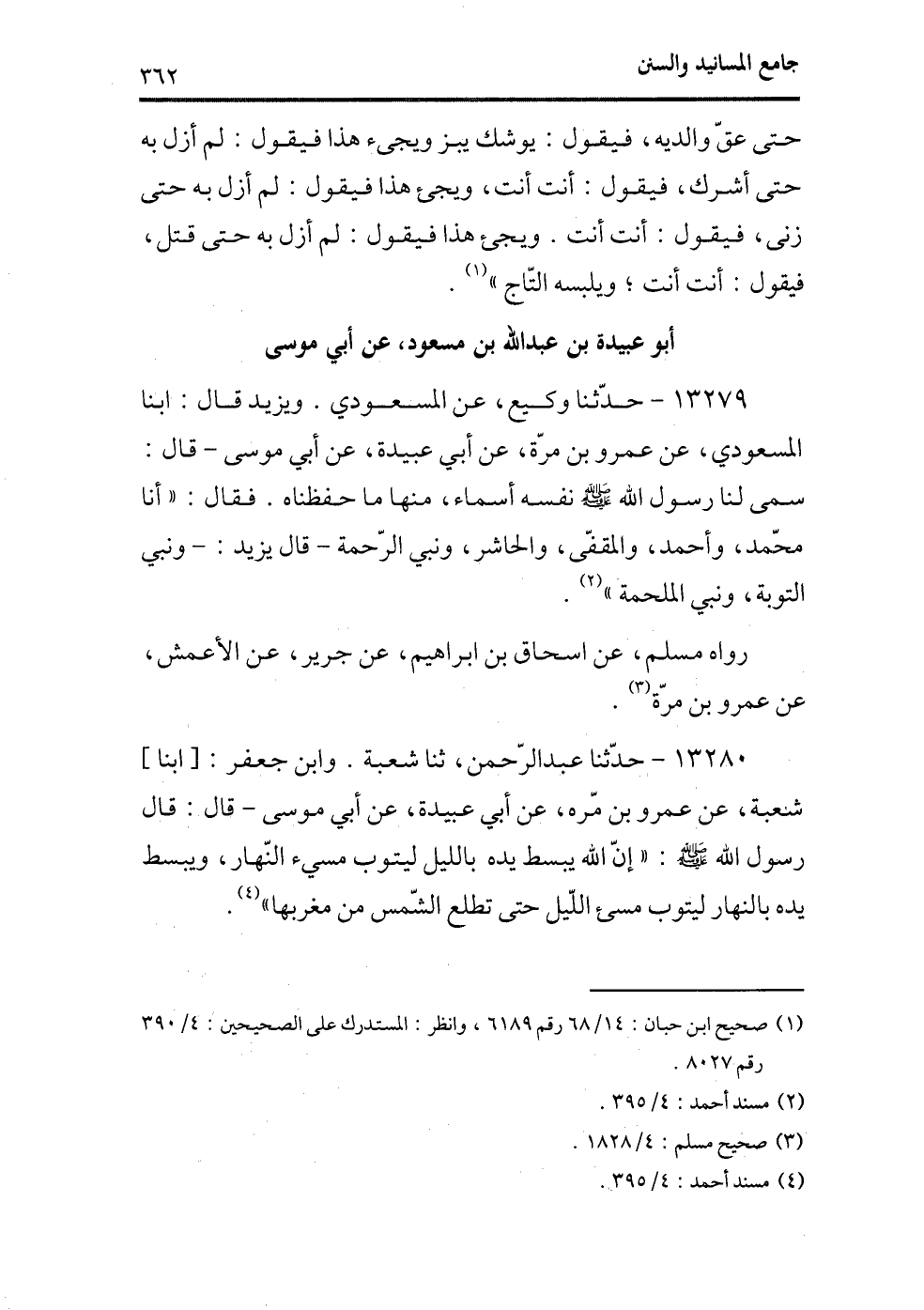 13280 - حدثنا عبد الرحمن، ثنا شعبة، وابن جعفر: [ابنا] شعبة، عن عمرو ابن مرة، عن أبي عبيدة، عن أبي موسى - قال: قال رسول الله - صلى الله عليه وسلم -: ((إن الله يبسط يده بالليل ليتوب مسيء النهار، ويبسط يده بالنهار ليتوب مسيء الليل حتى تطلع الشمس من مغربها)) (¬3) .
