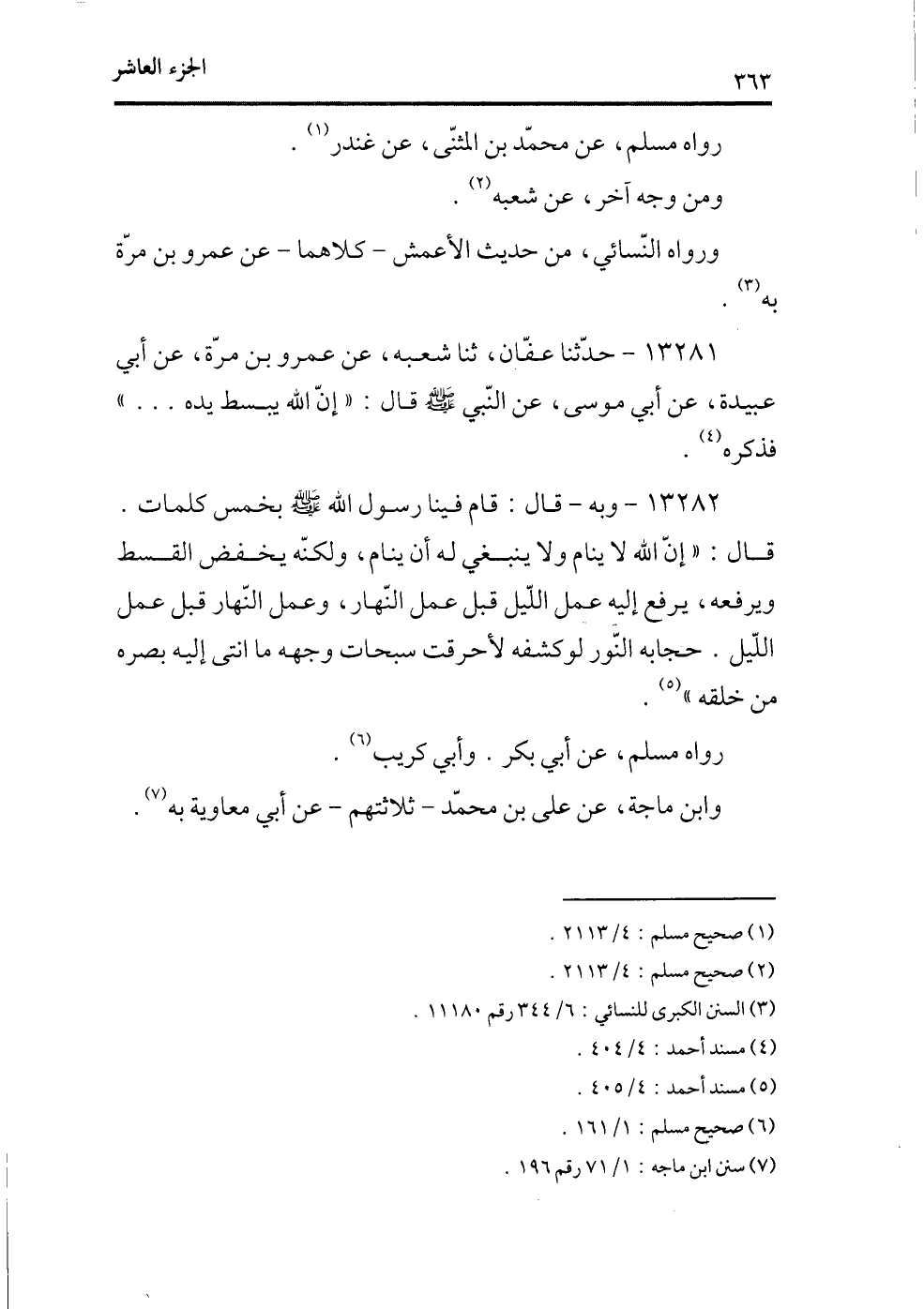 13281 - حدثنا عفان، ثنا شعبة، عن عمرو بن مرة، عن أبي عبيدة، عن أبي موسى، عن النبي - صلى الله عليه وسلم - قال: ((إن الله يبسط يده ... )) (¬1) . فذكره.