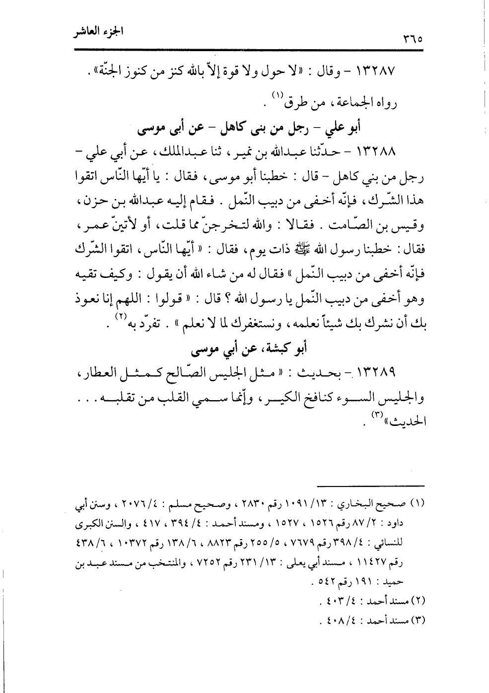 13288 - حدثنا عبد الله بن نمير، ثنا عبد الملك، عن أبي علي -رجل من بني كاهل- قال: خطبنا أبو موسى، فقال: ياأيها الناس اتقوا هذا الشرك، فإنه أخفى من دبيب النمل. فقام إليه عبد الله بن حزن، وقيس بن الصامت. فقالا: والله لتخرجن مما قلت، أو لأتين عمر، فقال: خطبنا رسول الله - صلى الله عليه وسلم - ذات يوم، فقال: ((أيها الناس، اتقوا الشرك فإنه أخفى من دبيب النمل)) فقال له من شاء الله أن يقول: وكيف تقيه وهو أخفى من دبيب النمل يارسول الله؟ قال: ((قولوا: اللهم إنا نعوذ بك أن نشرك بك شيئاً نعلمه، ونستغفرك لما لانعلم)) (¬2) . تفرد به.