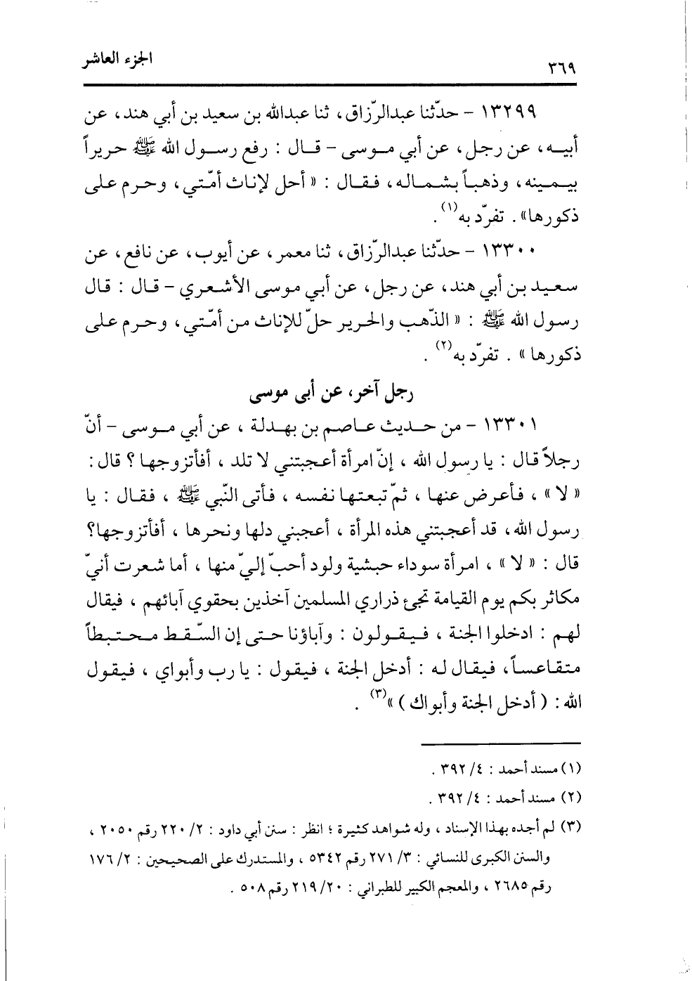 13300 - حدثنا عبد الرزاق، ثنا معمر، عن أيوب، عن نافع، عن سعيد بن أبي هند، عن رجل، عن أبي موسى الأشعري -قال: قال رسول الله - صلى الله عليه وسلم -: ((الذهب والحرير حل للإناث من أمتي، وحرم على ذكورها)) (¬2) . تفرد به.