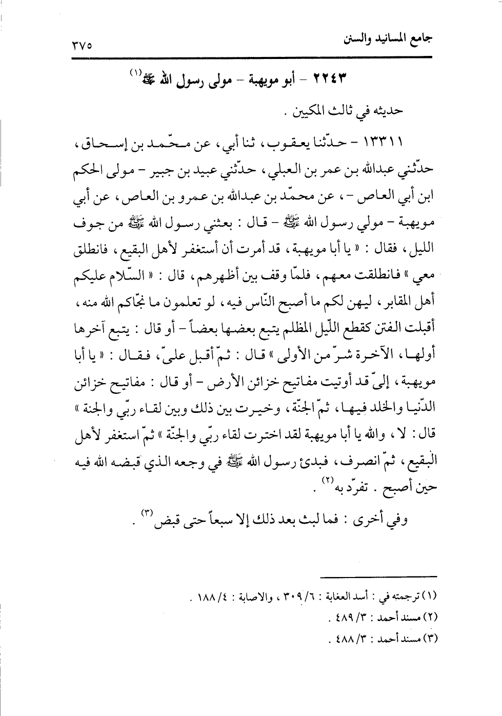 13311 - حدثنا يعقوب، ثنا أبي، عن محمد بن إسحاق، حدثني عبد الله بن عمر بن العبلي، حدثني عبيد بن جبير -مولى الحكم بن أبي العاص-، عن محمد بن عبد الله بن عمرو بن العاص، عن أبي مويهبة - مولى رسول الله - صلى الله عليه وسلم - قال: بعثني رسول الله - صلى الله عليه وسلم - من جوف الليل، فقال: ((ياأبا مويهبة، قد امرت أن أستغفر لأهل البقيع، فانطلق معي)) فانطلقت معهم، فلما وقف بين أظهرهم، قال: ((السلام عليكم أهل المقابر، ليهن لكم ماأصبح الناس فيه، لو تعلمون مانجاكم الله منه، أقبلت الفتن كقطع الليل المظلم يتبع بعضها بعضاً - أو قال: يتبع آخرها أولها، الآخرة شر من الأولى)) قال: ثم أقبل عليّ، فقال: ((يا أبا مويهبة، إلى قد أوتيت مفاتيح خزائن الأرض - أو قال: مفاتيح خزائن الدنيا والخلد فيها، ثم الجنة، وخيرت بين ذلك وبين لقاء ربي والجنة)) قال: لا، والله ياأبا مويهبة لقد اخترت لقاء ربي والجنة)) ثم استغفر لأهل البقيع، ثم انصرف، فبدئ رسول الله - صلى الله عليه وسلم - في وجعه الذي قبضه الله فيه حين أصبح (¬2) . تفرد به.