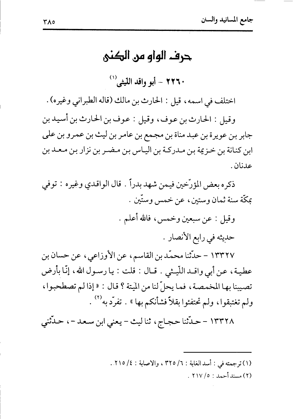 13327 - حدثنا محمد بن القاسم، عن الأوزاعي، عن حسان بن عطية، عن أبي واقد الليثي. قال: قلت: يارسول الله، إنا بأرض تصيبنا بها المخمصة، فما يحل لنا من الميتة؟ قال: ((إذا لم تصطحبوا، ولم تغتبقوا، ولم تحتفئوا بقلاً فشأنكم بها)) (¬2) . تفرد به.