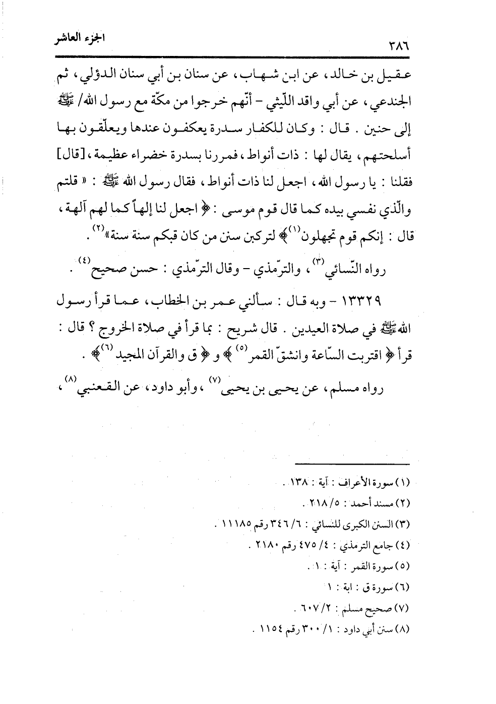 عقيل بن خالد، عن ابن شهاب، عن سنان بن أبي سنان الدؤلي، ثم الجندعي، عن أبي واقد الليثي - أنهم خرجوا من مكة مع رسول الله/ - صلى الله عليه وسلم - إلى حنين. قال: وكان للكفار سدرة يعكفون عندها ويعلقون بها أسلحتهم، يقال لها: ذات أنواط، فمررنا بسدرة خضراء عظيمة، [قال] فقلنا: يارسول الله، اجعل لنا ذات أنواط، فقال رسول الله - صلى الله عليه وسلم -: ((قلتم والذي نفسي بيده كما قال قوم موسى: {اجْعَلْ لَنَا إِلَهًا كَمَا لَهُمْءَالِهَةٌ قَالَ إِنَّكُمْ قَوْمٌ تَجْهَلُونَ} (¬1) لتركبن سنن من كان قبلكم سنة سنة)) (¬2) .