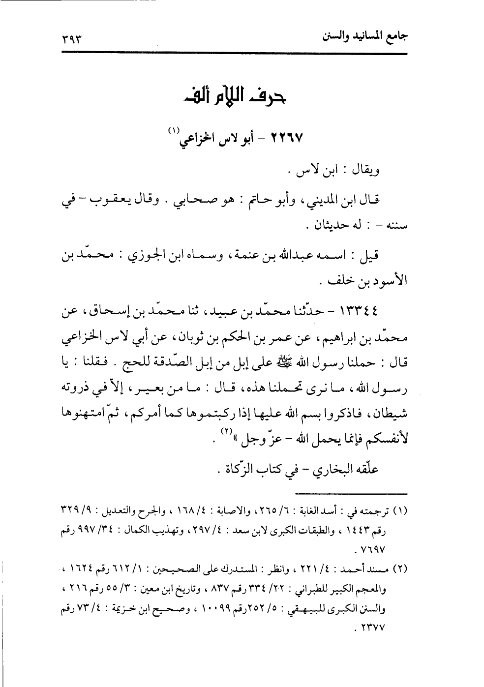 13344 - حدثنا محمد بن عبيد، ثنا محمد بن إسحاق، عن محمد بن ابراهيم، عن عمر بن الحكم بن ثوبان، عن أبي لاس الخزاعي قال: حملنا رسول الله - صلى الله عليه وسلم - على إبل من إبل الصدقة للحج. فقلنا: يارسول الله، مانرى تحملنا هذه، قال: مامن بعير، إلا في ذروته شيطان، فاذكروا بسم الله عليها إذا ركبتموها كما أمركم، ثم امتهنوها لأنفسكم فإنما يحمل الله - عز وجل)) (¬2) .