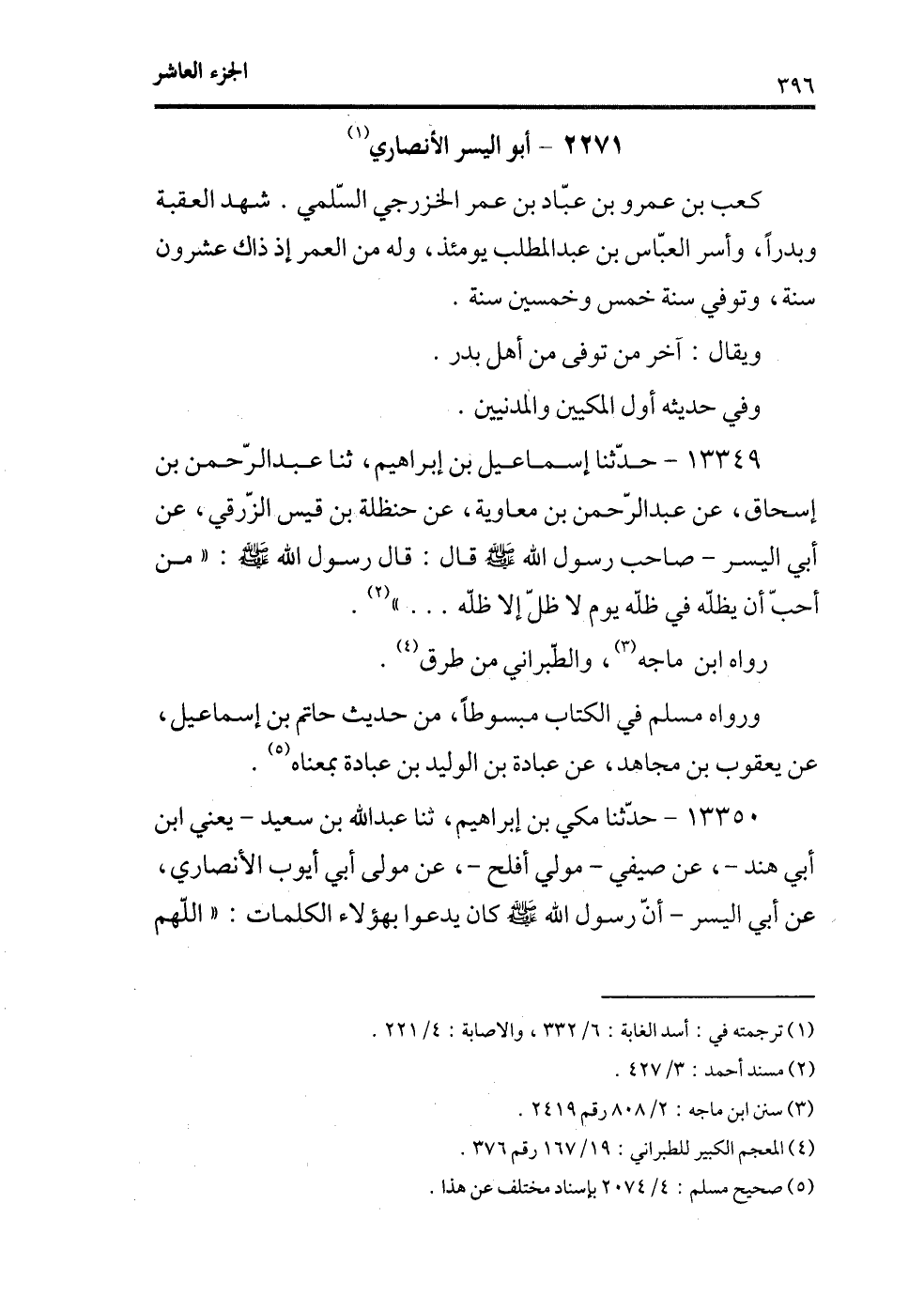 13349 - حدثنا إسماعيل بن إبراهيم، ثنا عبد الرحمن بن إسحاق، عن عبد الرحمن بن معاوية، عن حنظلة بن قيس الزرقي، عن أبي اليسر - صاحب رسول الله - صلى الله عليه وسلم - قال: قال رسول الله - صلى الله عليه وسلم -: ((من أحب أن يظله في ظله يوم لاظل إلا ظله ... )) (¬2) .