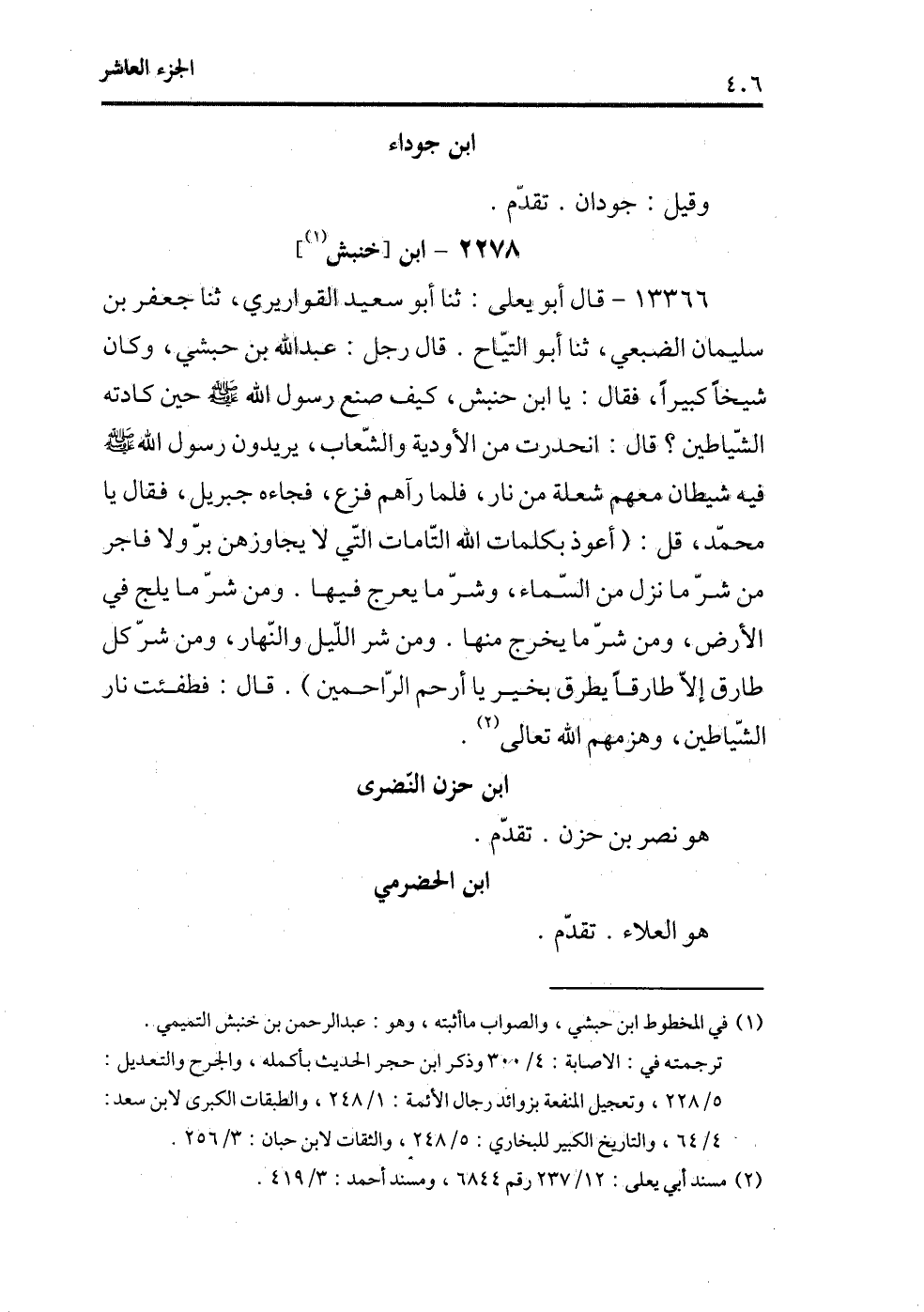 13366 - قال أبو يعلى: ثنا أبو سعيد القواريري، ثنا جعفر بن سليمان الضبعي، ثنا أبو التياح. قال رجل: عبد الله بن حبشي، وكان شيخاً كبيراً، فقال: ياابن حنبش، كيف صنع رسول الله - صلى الله عليه وسلم - حين كادته الشياطين؟ قال: انحدرت من الأودية والشعاب، يريدون رسول الله - صلى الله عليه وسلم - فيه شيطان معهم شعلة من نار، فلما رآهم فزع، فجاءه جبريل، فقال يامحمد، قل: (أعوذ بكلمات الله التامات التي لايجاوزهن برّ ولافاجر من شر مانزل من السماء، وشر مايعرج فيها، ومن شر مايلج في الأرض، ومن شر مايخرج منها، ومن شر الليل والنهار، ومن كل طارق إلا طارقاً يطرق بخير ياأرحم الراحمين) . قال: فطفئت نار الشياطين، وهزمهم الله تعالى (¬2) .
