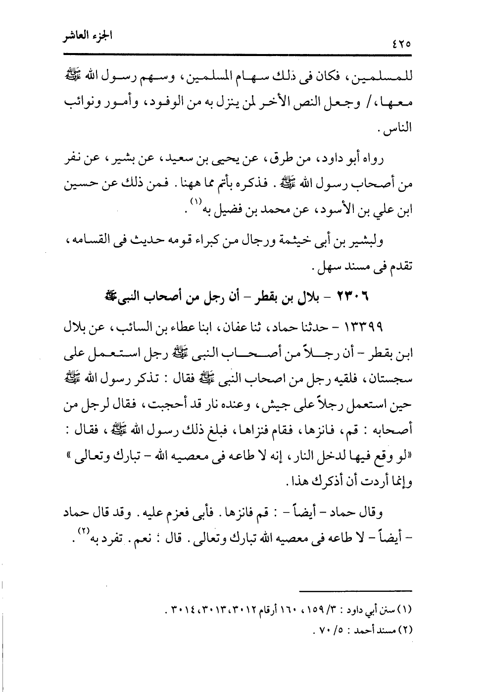 13399 - حدثنا حماد، ثنا عفان، ابنا عطاء بن السائب، عن بلال بن بقطر- أن رجلاً من أصحاب النبي - صلى الله عليه وسلم - رجل استعمل على سجستان، فلقيه رجل من أصحاب النبي - صلى الله عليه وسلم - فقال: تذكر رسول الله - صلى الله عليه وسلم - حين استعمل رجلاً على جيش، وعنده نار قد أحجبت، فقال الرجل من أصحابه: قم، فانزها، فقام فنزاها، فبلغ ذلك رسول الله - صلى الله عليه وسلم -، فقال: ((لو وقع فيها لدخل النار، إنه لاطاعة في معصية الله -تبارك وتعالى)) وإنما أردت أن أذكرها هذا.