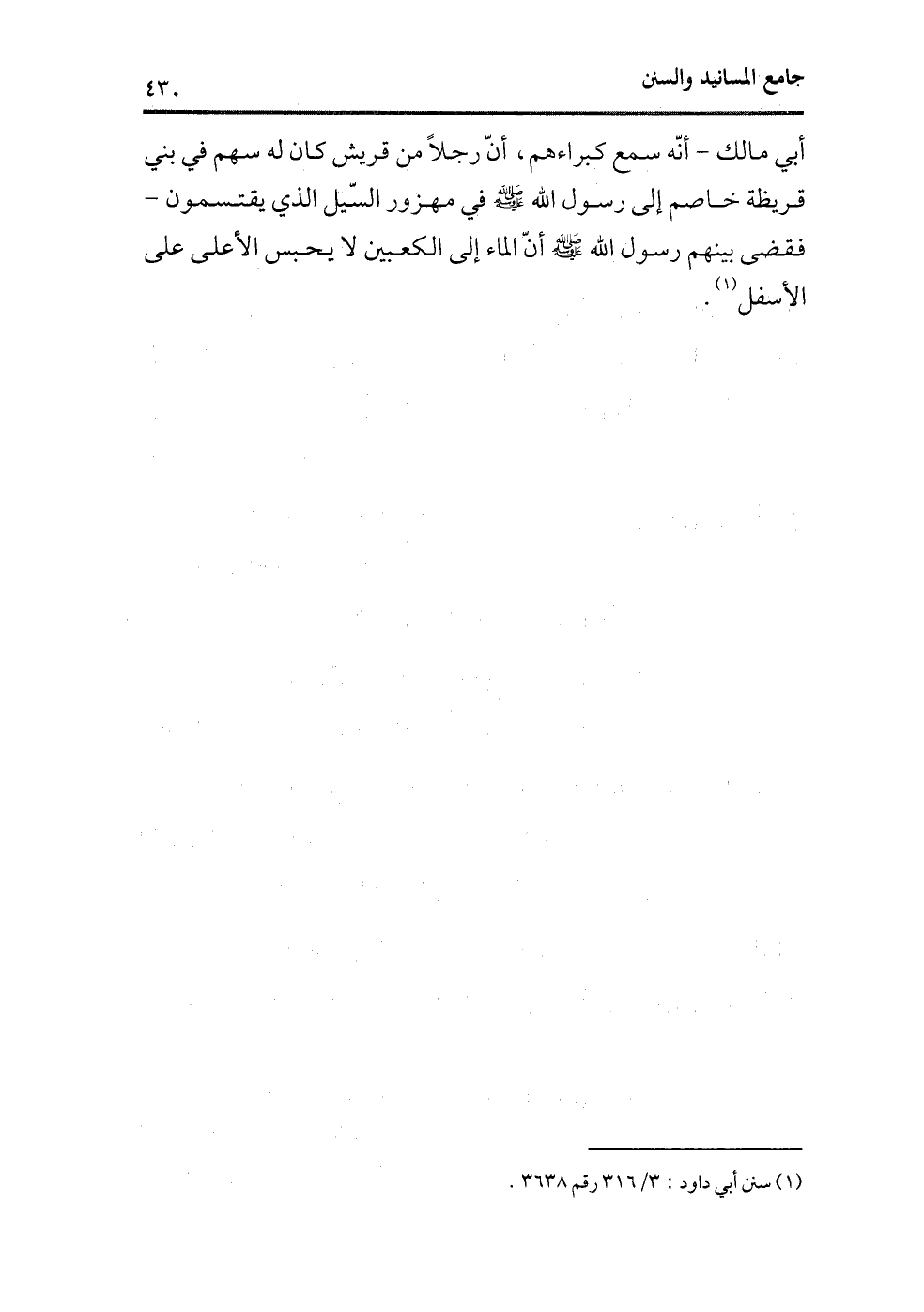 أبي مالك -أنه سمع كبراءهم، أن رجلاً من قريش كان له سهم في بني قريظة خاصم إلى رسول الله - صلى الله عليه وسلم - في مهزور السيل الذي يقتسمون - فقضى بينهم رسول الله - صلى الله عليه وسلم - أن الماء إلى الكعبين لايحبس الأعلى على الأسفل (¬1) .