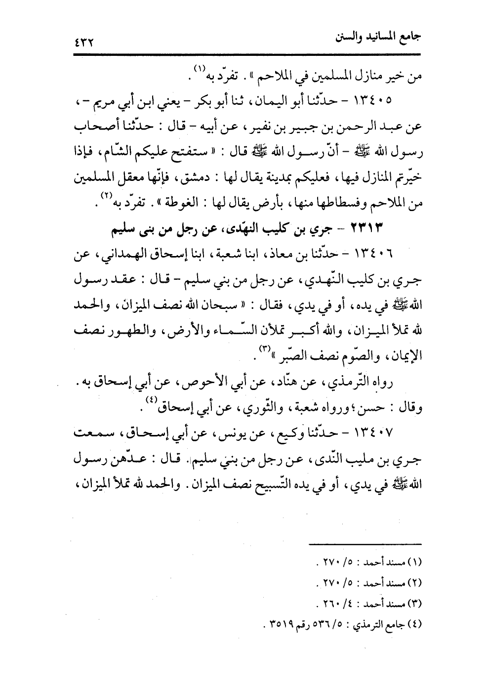 13406 - حدثنا ابن معاذ، ابنا شعبة، ابنا إسحاق الهمداني، عن جري بن كليب النهدي، عن رجل من بني سليم -قال: عقد رسول الله - صلى الله عليه وسلم - في يده، أو في يدي، فقال: ((سبحان الله نصف الميزان، والحمد لله تملأ الميزان، والله أكبر تملأن السماء والأرض، والطهور نصف الإيمان، والصوم نصف الصبر)) (¬2) .