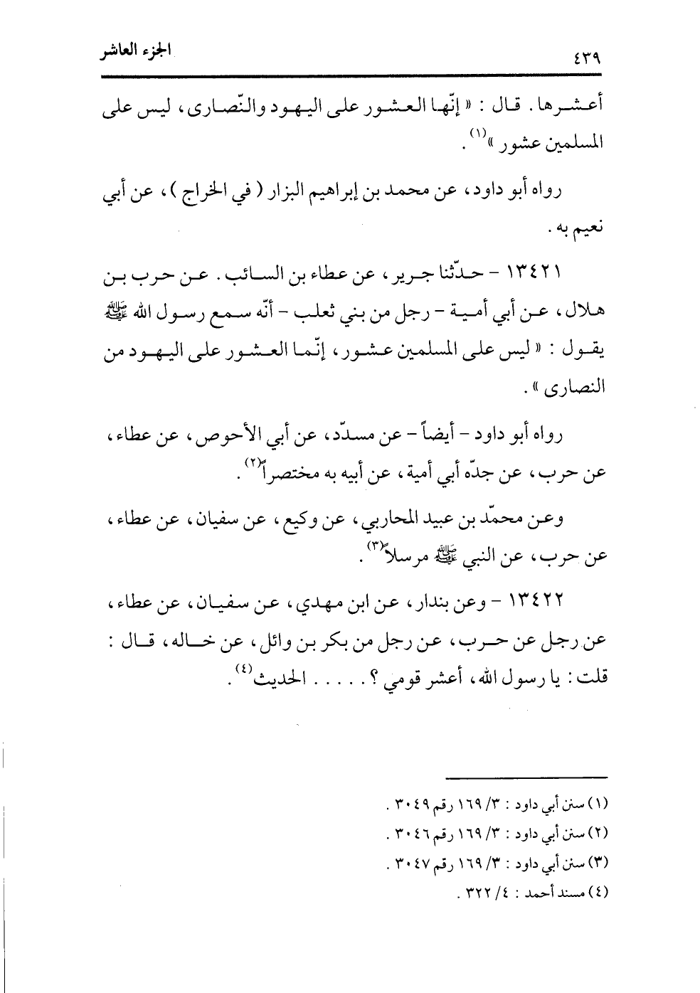 13422 - وعن بندار، عن ابن مهدي، عن سفيان، عن عطاء، عن رجل عن حرب، عن رجل من بكر بن وائل، عن خاله، قال: قلت: يارسول الله، أعشر قومي؟.... الحديث (¬3) .