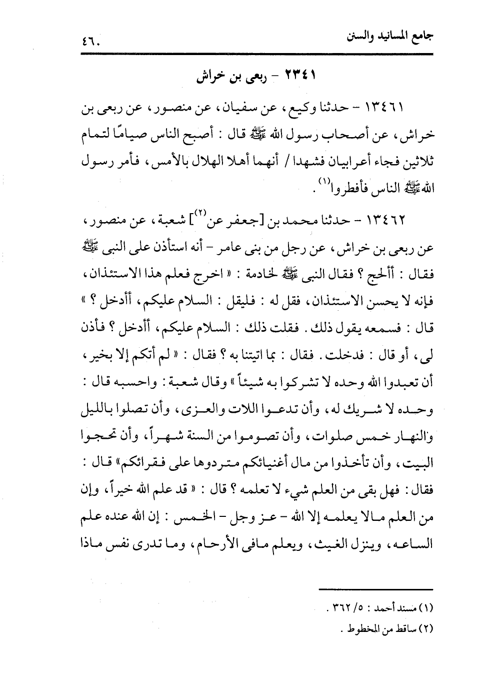 13462 - حدثنا محمد بن [جعفر عن] (¬2) شعبة، عن منصور، عن ربعى بن خراش، عن رجل من بني عامر -أنه استأذن على النبي - صلى الله عليه وسلم - فقال: أألحج؟ فقال النبي - صلى الله عليه وسلم - لخادمه: ((اخرج فعلم هذا الاستئذان، فإنه لايحسن الاستئذان، فقل له: فليقل: السلام عليكم، أأدخل؟)) قال: فسمعه يقول ذلك. فقلت ذلك: السلام عليكم، أأدخل؟ فأذن لي، أو قال: فدخلت. فقال: بما أتيتنا به؟ فقال: ((لم أتكلم إلا بخير، أن تعبدوا الله وحده لاتشركوا به شيئاً)) وقال شعبة: وأحسبه قال: وحده لاشريك له، وأن تَدَعُوا اللات والعزى، وأن تصلوا بالليل والنهار خمس صلوات، وأن تصوموا من السنة شهراً، وأن تحجوا البيت، وأن تأخذوا من مال أغنيائكم وتردوها على فقرائكم)) قال: فقال: فهل بقي من العلم شيء لاتعلمه؟ قال: ((قد علم الله خيراً، وإن من العلم مالايعلمه إلا الله -عز وجل- الخمس: إن الله عنده علم الساعة، وينزل الغيث، ويعلم مافي الأرحام، وماتدري نفس ماذا