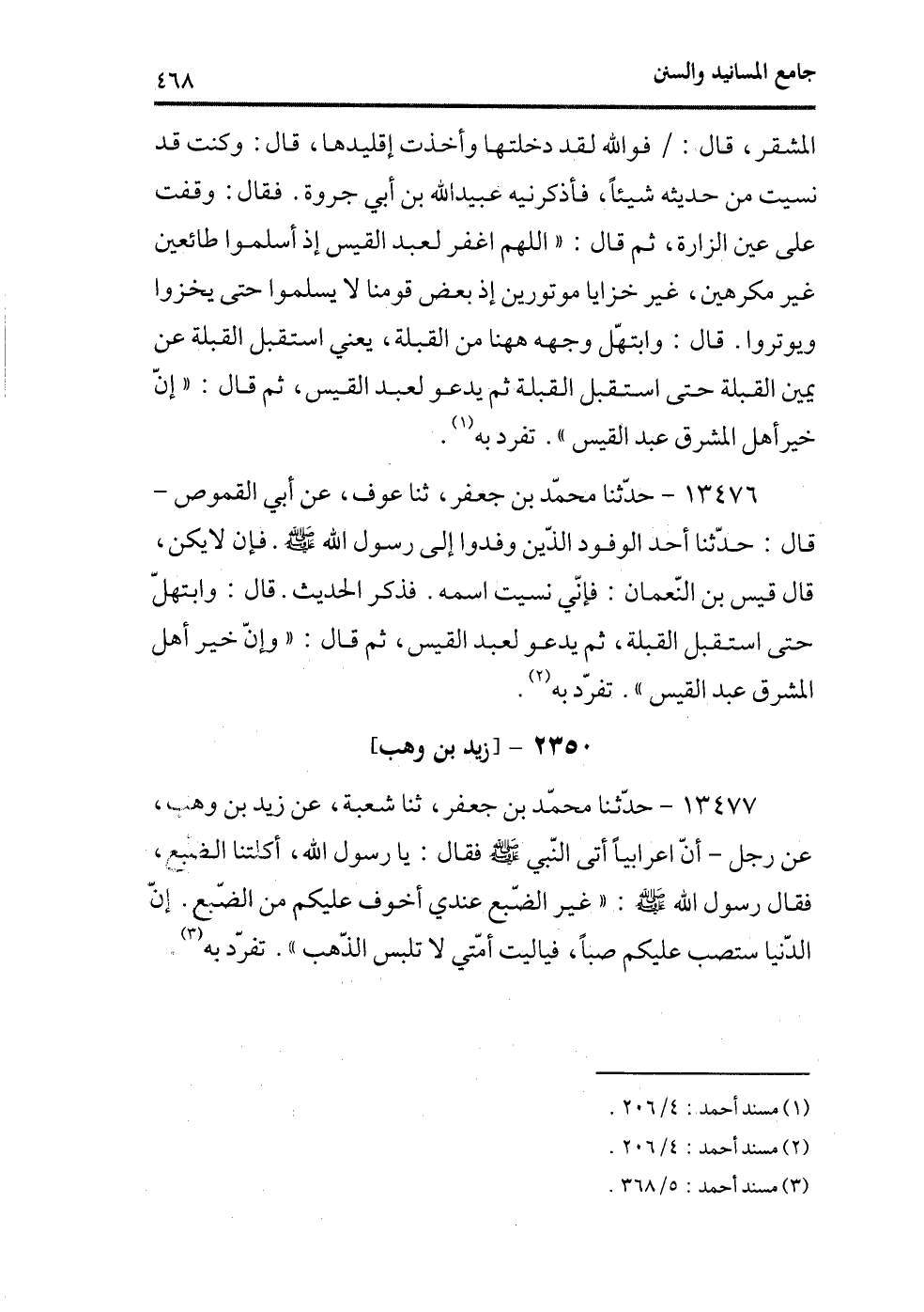 13476 - حدثنا محمد بن جعفر، ثنا عوف، عن أبي القموص -قال: حدثنا أحد الوفود الذين وفدوا إلى رسول الله - صلى الله عليه وسلم -. فإن لايكن، قال قيس بن النعمان: فإني نسيت اسمه. فذكر الحديث. قال: وابتهل حتى استقبل القبلة، ثم يدعو لعبد القيس، ثم قال: ((وإن خير أهل المشرق عبد القيس)) (¬1) . تفرد به.