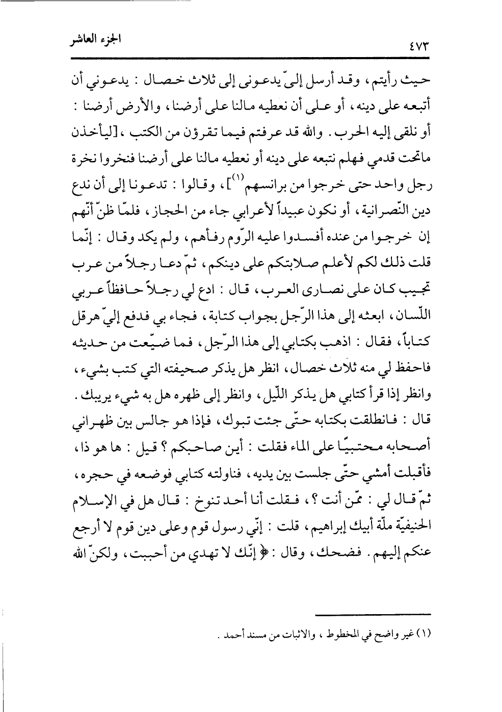 حيث رأيتم، وقد أرسل إلىّ يدعوني إلى ثلاث خصال: يدعوني أن أتبعه على دينه، أو على أن نعطيه مالنا على أرضنا، والأرض أرضنا: أو نلقى إليه الحرب. والله قد عرفتم فيما تقرؤن من الكتب، [ليأخذن ماتحت قدمي فهلم نتبعه على دينه أو نعطيه مالنا على أرضنا فنخروا نخرة رجل واحد حتى خرجوا من برانسهم] (¬1) ، وقالوا: تدعونا إلى أن ندع دين النصرانية، أو نكون عبيداً لأعرابي جاء من الحجاز، فلما ظن أنهم إن خرجوا من عنده أفسدوا عليه الروم رفأهم، ولم يكد وقال: إنما قلت ذلك لكم لأعلم صلابتكم على دينكم، ثم دعا رجلاً من عرب تجيب كان على نصارى العرب، قال: ادع لي رجلاً حافظاً عربي اللسان، ابعثه إلى هذا الرجل بجواب كتابة، فجاء بي فدفع إلىّ هرقل كتاباً، فقال: اذهب بكتابي إلى هذا الرجل، فما ضيعت من حديثه فاحفظ لي منه ثلاث خصال، انظر هل يذكر صحيفته التي كتب بشئ، وانظر إذا قرأ كتابي هل يذكر الليل، وانظر إلى ظهره هل به شيء يريبك.