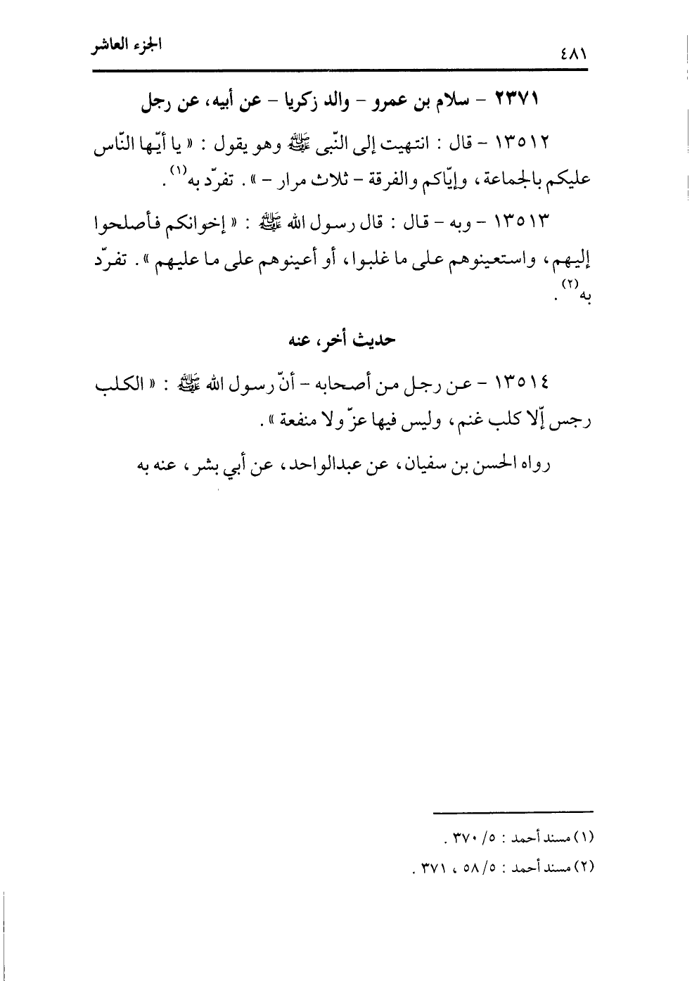13512 - قال: انتهيت إلى النبي - صلى الله عليه وسلم - وهو يقول: ((يا أيها الناس عليكم بالجماعة، وإياكم والفرقة -ثلاث مرار-)) (¬1) . تفرد به.