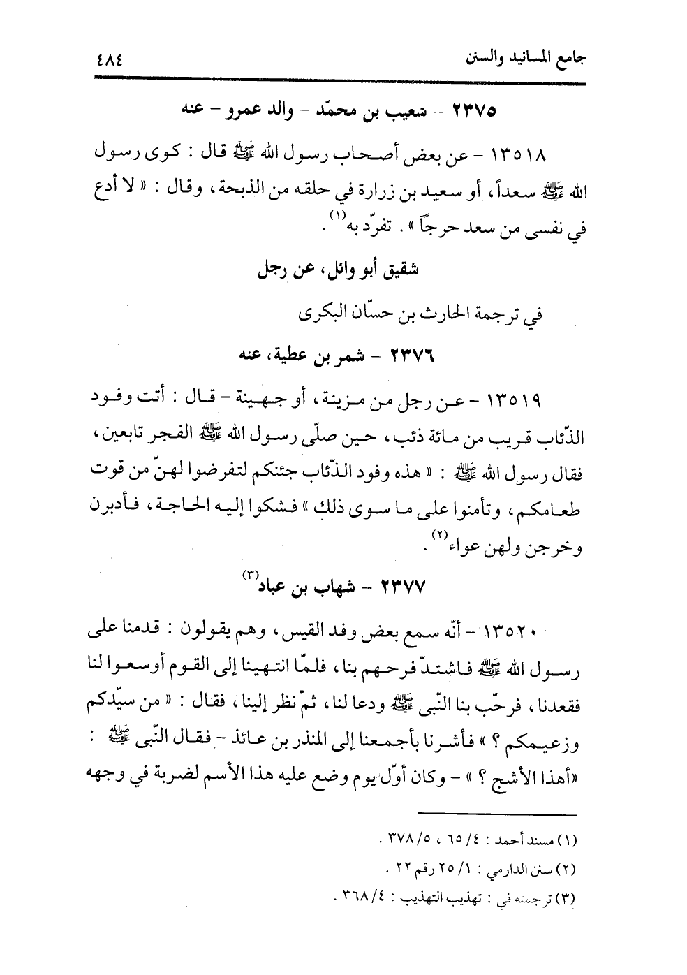 13519 - عن رجل من مزينةن أو جهينة - قال: أتت وفود الذئاب قريب من مائة ذئب، حين صلى رسول الله - صلى الله عليه وسلم - الفجر تابعين، فقال رسول الله - صلى الله عليه وسلم -: ((هذه وفود الذئاب جئنكم لتفرضوا لهن من قوت طعامكم، وتأمنوا على ماسوى ذلك)) فشكوا إليه الحاجة، فأدبرن وخرجن ولهن عواء (¬2) .
