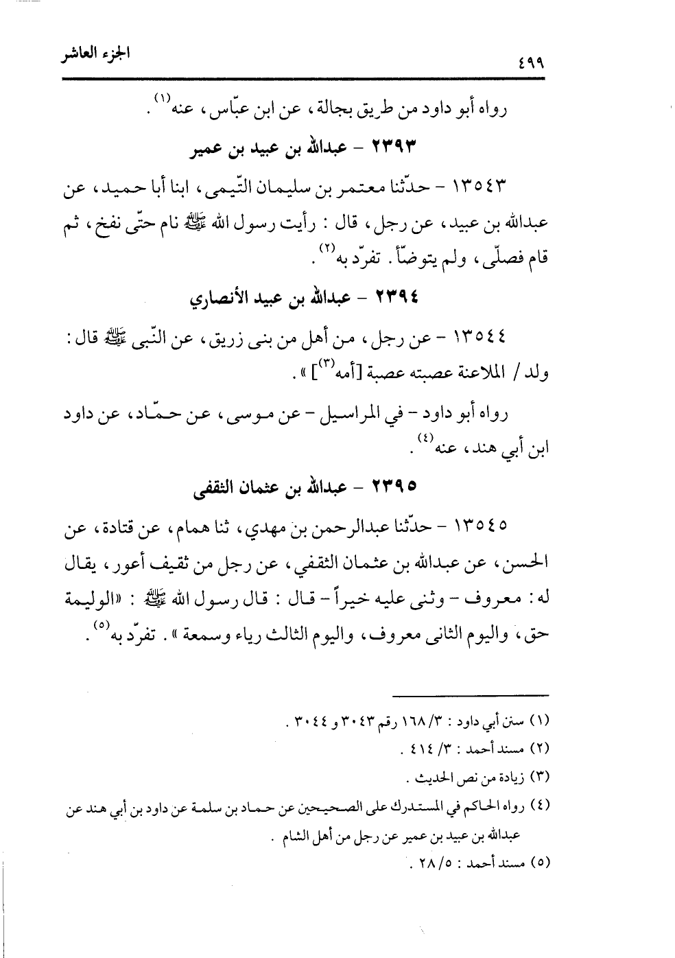 13545 - حدثنا عبد الرحمن بن مهدي، ثنا همام، عن قتادة، عن الحسن، عن عبيد الله بن عثمان الثقفي، عن رجل من ثقيف أعور، يقال له: معروف -وثنى عليه خيراً- قال: قال رسول الله - صلى الله عليه وسلم -: ((الوليمة حق، واليوم الثاني معروفن واليوم الثالث رياء وسمعة)) (¬4) . تفرد به.