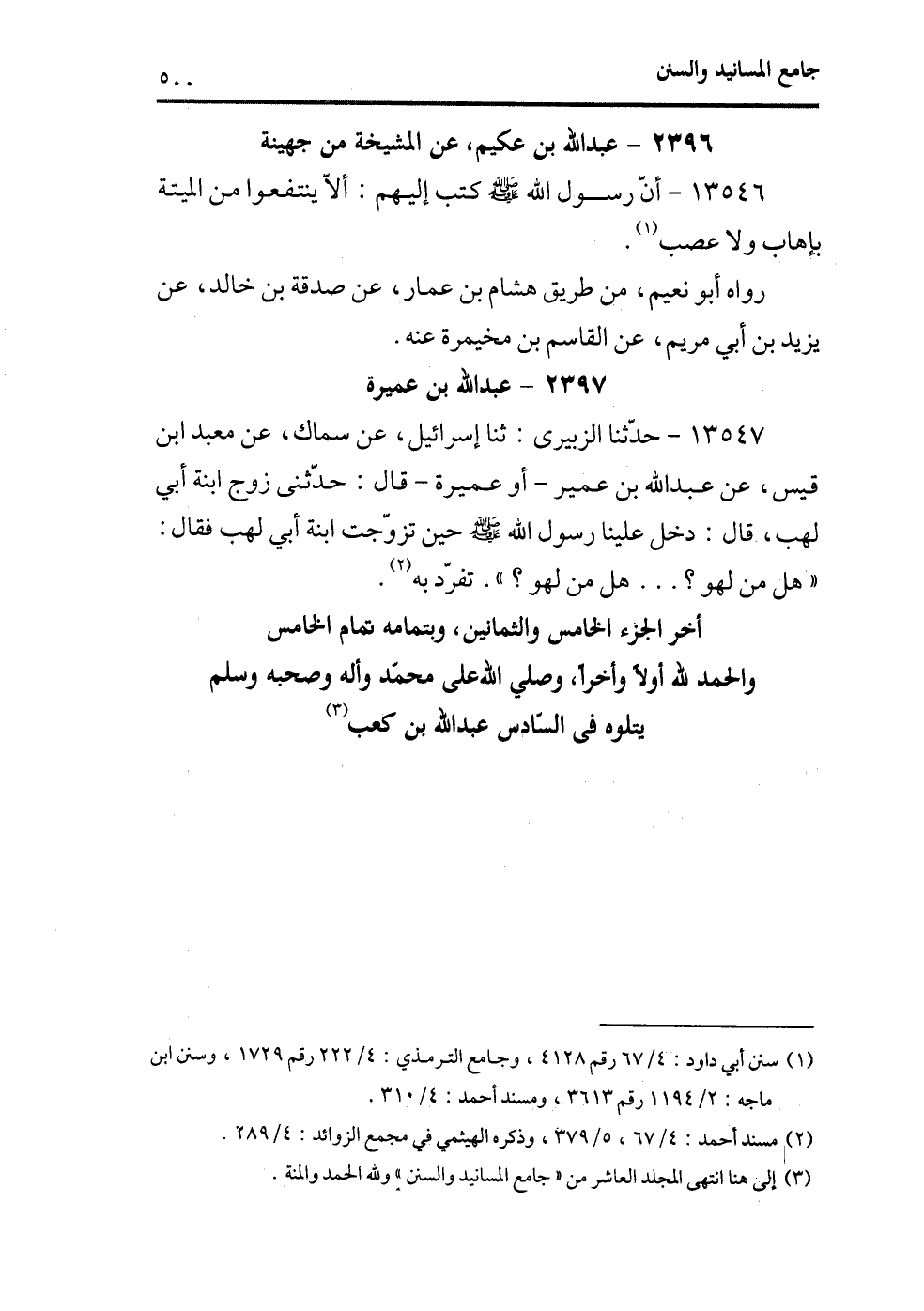 (¬3) إلى هنا انتهى المجلد السابع من ((جامع المسانيد والسنن) وهو آخر ماعثرنا عليه من مخطوطة هذا الكتاب، ولله الحمد والمنة.