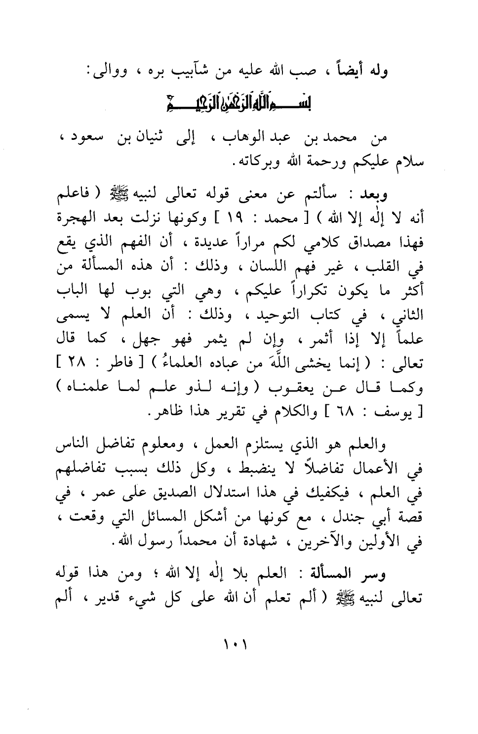 وبعد: سألتم عن معنى قوله تعالى لنبيه صلى الله عليه وسلم: {فَاعْلَمْ أَنَّهُ لا إِلَهَ إِلَّا اللَّهُ} 1، وكونها نزلت بعد الهجرة، فهذا مصداق كلامي لكم مرارا عديدة، أن الفهم الذي يقع في القلب، غير فهم اللسان، وذلك: أن هذه المسألة من أكثر ما يكون تكرارا عليكم، وهى التي بوب لها الباب الثاني، في كتاب التوحيد، وذلك: أن العلم لا يسمى علما إلا إذا أثمر، وإن لم يثمر فهو جهل، كما قال تعالى: {إِنَّمَا يَخْشَى اللَّهَ مِنْ عِبَادِهِ الْعُلَمَاءُ} 2، وكما قال عن يعقوب: {وَإِنَّهُ لَذُو عِلْمٍ لِمَا عَلَّمْنَاهُ} 3.والكلام في تقرير هذا ظاهر.