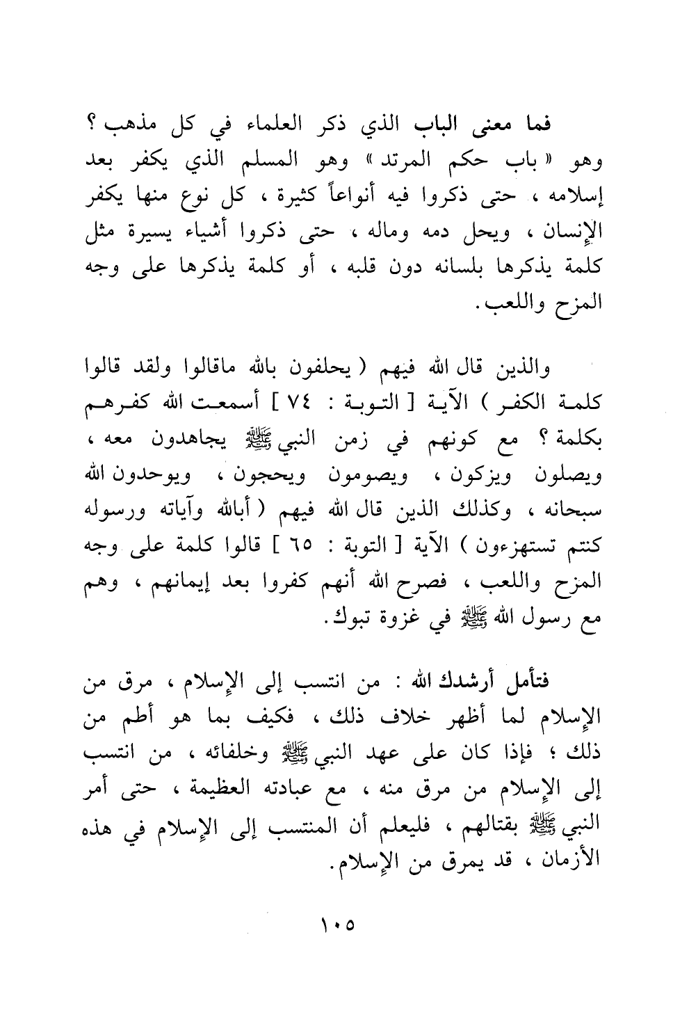 فما معنى الباب الذي ذكر العلماء في كل مذهب؟ وهو: "باب حكم المرتد"، وهو المسلم الذي يكفر بعد إسلامه، حتى ذكروا فيه أنواعا كثيرة، كل نوع منها يكفّر الإنسان، ويحل دمه وماله؛ حتى ذكروا أشياء يسيرة مثل كلمة يذكرها بلسانه دون قلبه، أو كلمة يذكرها على وجه المزح واللعب.