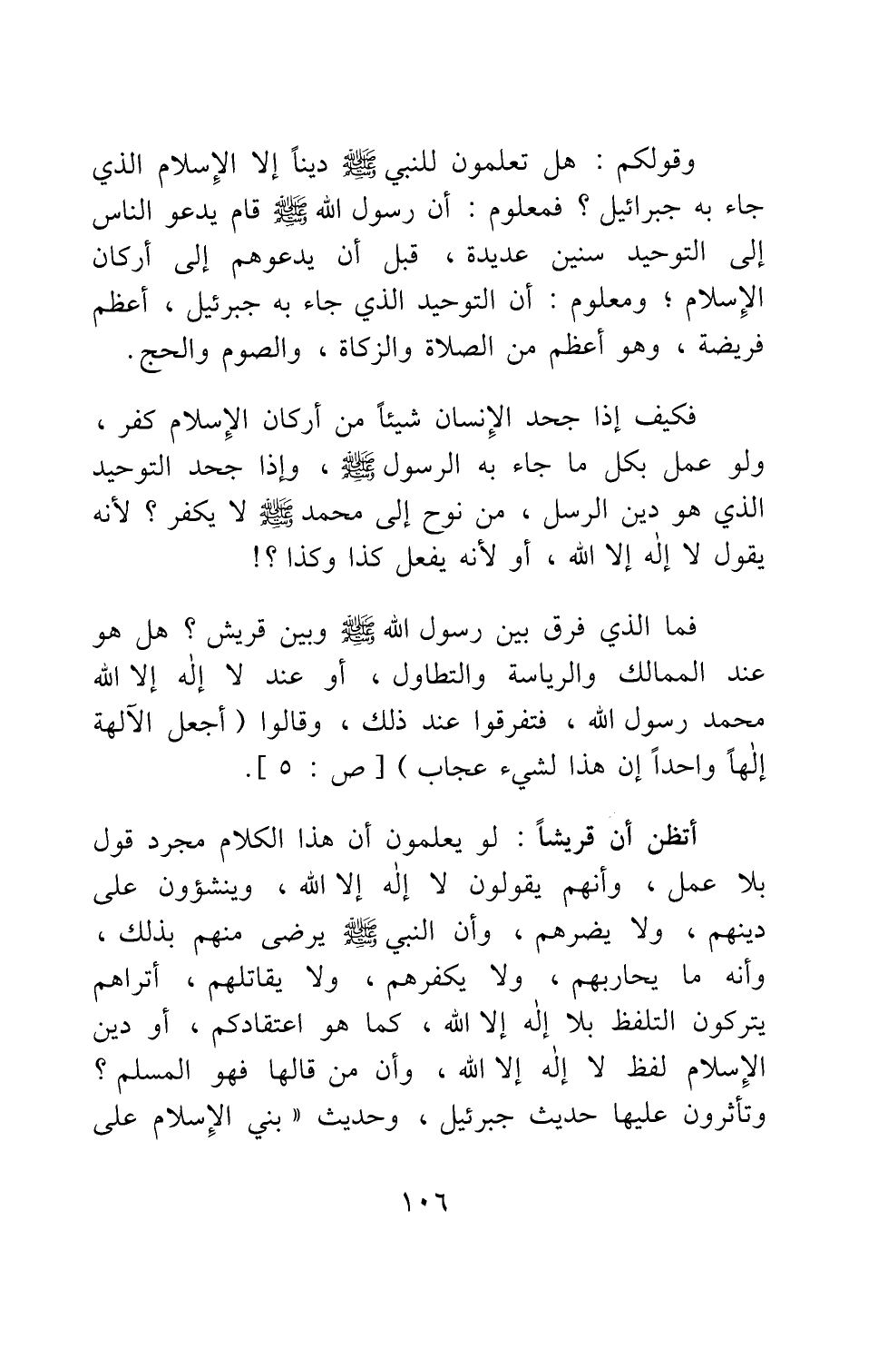أتظن أن قريشا لو يعلمون أن هذا الكلام مجرد قول بلا عمل، وأنهم يقولون لا إله إلا الله، وينشؤون على دينهم، ولا يضرهم، وأن النبي صلى الله عليه وسلم يرضى منهم بذلك، وأنه ما يحاربهم، ولا يكفرهم، ولا يقاتلهم، أتراهم يتركون التلفظ بلا إله إلا الله، كما هو اعتقادكم، أو دين الإسلام لفظ لا إله إلا الله، وأن من قالها فهو المسلم؟ وتؤثرون عليها حديث جبرائيل، وحديث: " بني الإسلام على