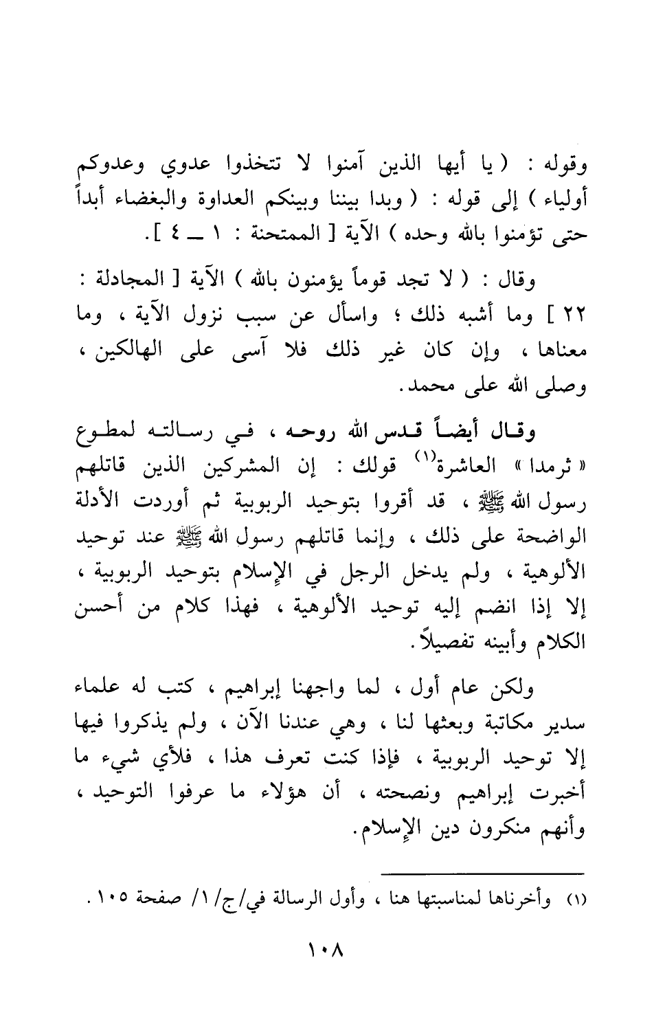 وقال أيضا قدس الله روحه، في رسالته لمطوع ثرمدا العاشرة 4: قولك: إن المشركين الذين قاتلهم رسول الله صلى الله عليه وسلم قد أقروا بتوحيد الربوبية، ثم أوردت الأدلة الواضحة على ذلك؛ وإنما قاتلهم رسول الله صلى الله عليه وسلم عند توحيد الألوهية، ولم يدخل الرجل في الإسلام بتوحيد الربوبية، إلا إذا انضم إليه توحيد الألوهية. فهذا كلام من أحسن الكلام وأبينه تفصيلا.