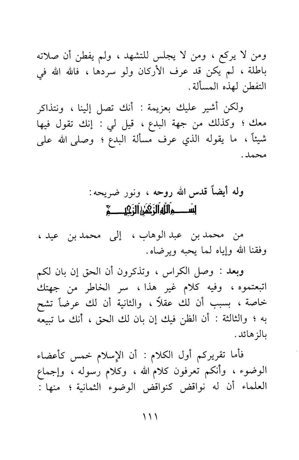 من محمد بن عبد الوهاب، إلى محمد بن عيد، وفقنا الله وإياه لما يحبه ويرضاه.