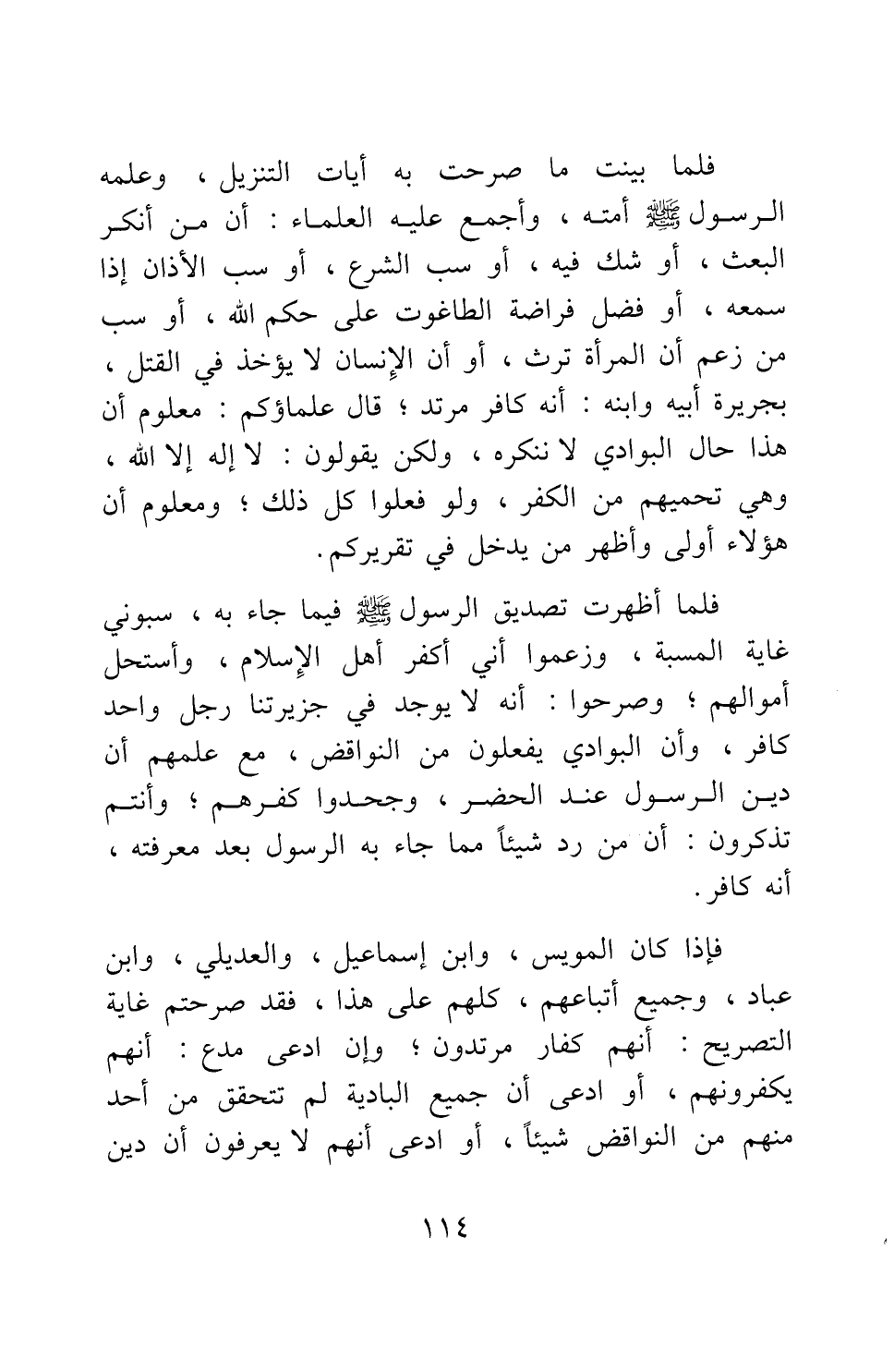 فلما بينت ما صرحت به آيات التنْزيل، وعلمه الرسول صلى الله عليه وسلم أمته، وأجمع عليه العلماء: أن من أنكر البعث، أو شك فيه، أو سب الشرع، أو سب الأذان إذا سمعه، أو فضل فراضة الطاغوت على حكم الله، أو سب من زعم أن المرأة ترث، أو أن الإنسان لا يؤخذ في القتل بجريرة أبيه وابنه، أنه كافر مرتد; قال علماؤكم: معلوم أن هذا حال البوادي لا ننكره، ولكن يقولون: لا إله إلا الله، وهي تحميهم من الكفر، ولو فعلوا كل ذلك; ومعلوم أن هؤلاء أولى وأظهر من يدخل في تقريركم.